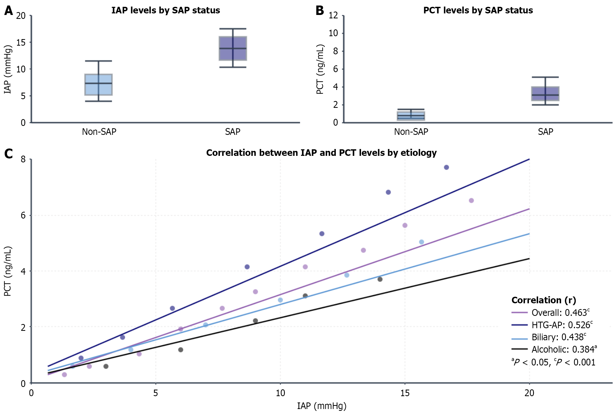A and B: Intra-abdominal pressure and procalcitonin levels in patients with and without severe acute pancreatitis (cP < 0.001); C: Correlation analysis showed significant heterogeneity across etiologies. The strongest heterogeneity was detected in patients with hypertriglyceridemic acute pancreatitis (AP) (r = 0.526, cP < 0.001), moderate heterogeneity was detected in patients with biliary AP (r = 0.438, cP < 0.001), and the weakest heterogeneity was detected in patients with alcoholic AP (r = 0.384, aP < 0.05). IAP: Intra-abdominal pressure; PCT: Procalcitonin; SAP: Severe acute pancreatitis; HTG-AP: Hypertriglyceridemic acute pancreatitis.