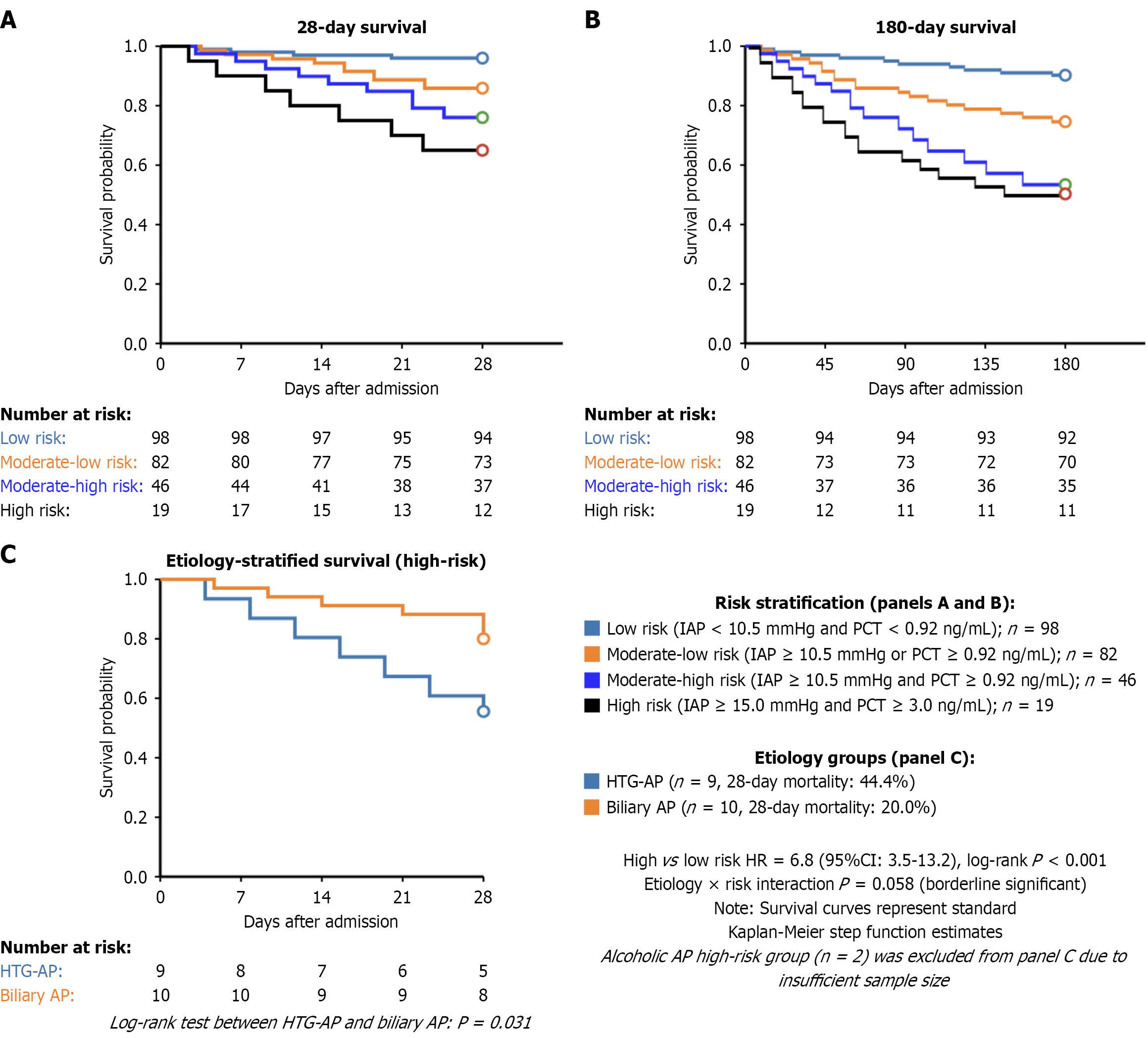 A and B: 28-day and 180-day survival curves demonstrated progressively worse outcomes with higher risk stratification (log-rank P < 0.001; high-risk vs low-risk hazard ratio = 6.8, 95% confidence interval: 3.5-13.2); C: Etiology-stratified survival of patients at high risk with the worst outcomes in the hypertriglyceridemic acute pancreatitis group (interaction P = 0.058). AP: Acute pancreatitis; HR: Hazard ratio; HTG-AP: Hypertriglyceridemic acute pancreatitis; IAP: Intra-abdominal pressure; PCT: Procalcitonin; CI: Confidence interval.