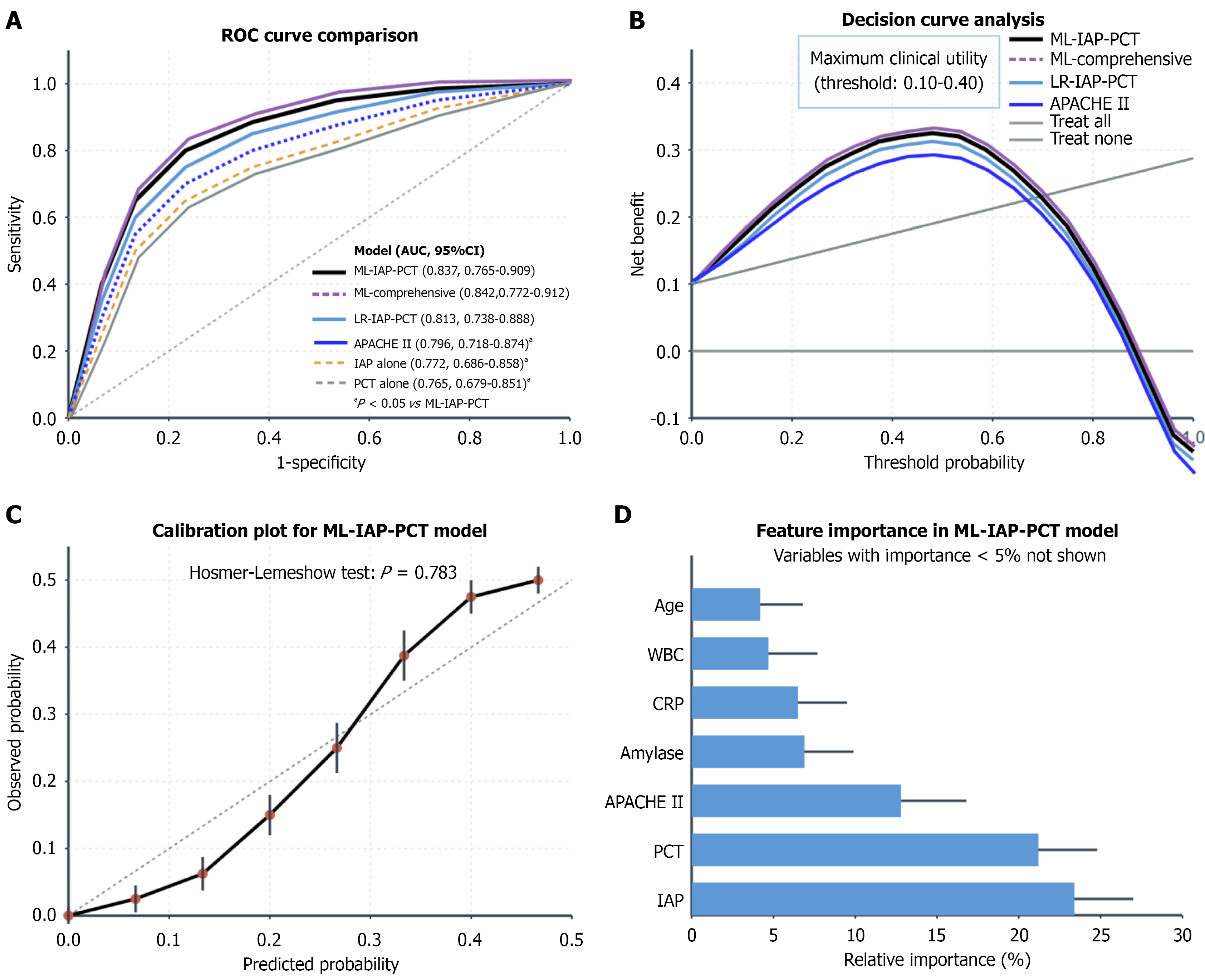 A: Receiver operating characteristic curves comparing prediction models. The machine learning-intra-abdominal pressure-procalcitonin (area under the curve = 0.837) outperformed single-marker models and the Acute Physiology and Chronic Health Evaluation II score (all P < 0.05); B: Decision curve analysis showed optimal clinical utility at thresholds of 0.10-0.40; C: Calibration plot (Hosmer–Lemeshow test, P = 0.783); D: Feature importance analysis confirmed intra-abdominal pressure and procalcitonin as leading predictors. APACHE II: Acute Physiology and Chronic Health Evaluation II; AUC: Area under the curve; CRP: C-reactive protein; IAP: Intra-abdominal pressure; LR: Logistic regression; ML: Machine learning; PCT: Procalcitonin; ROC: Receiver operating characteristic; CI: Confidence interval.