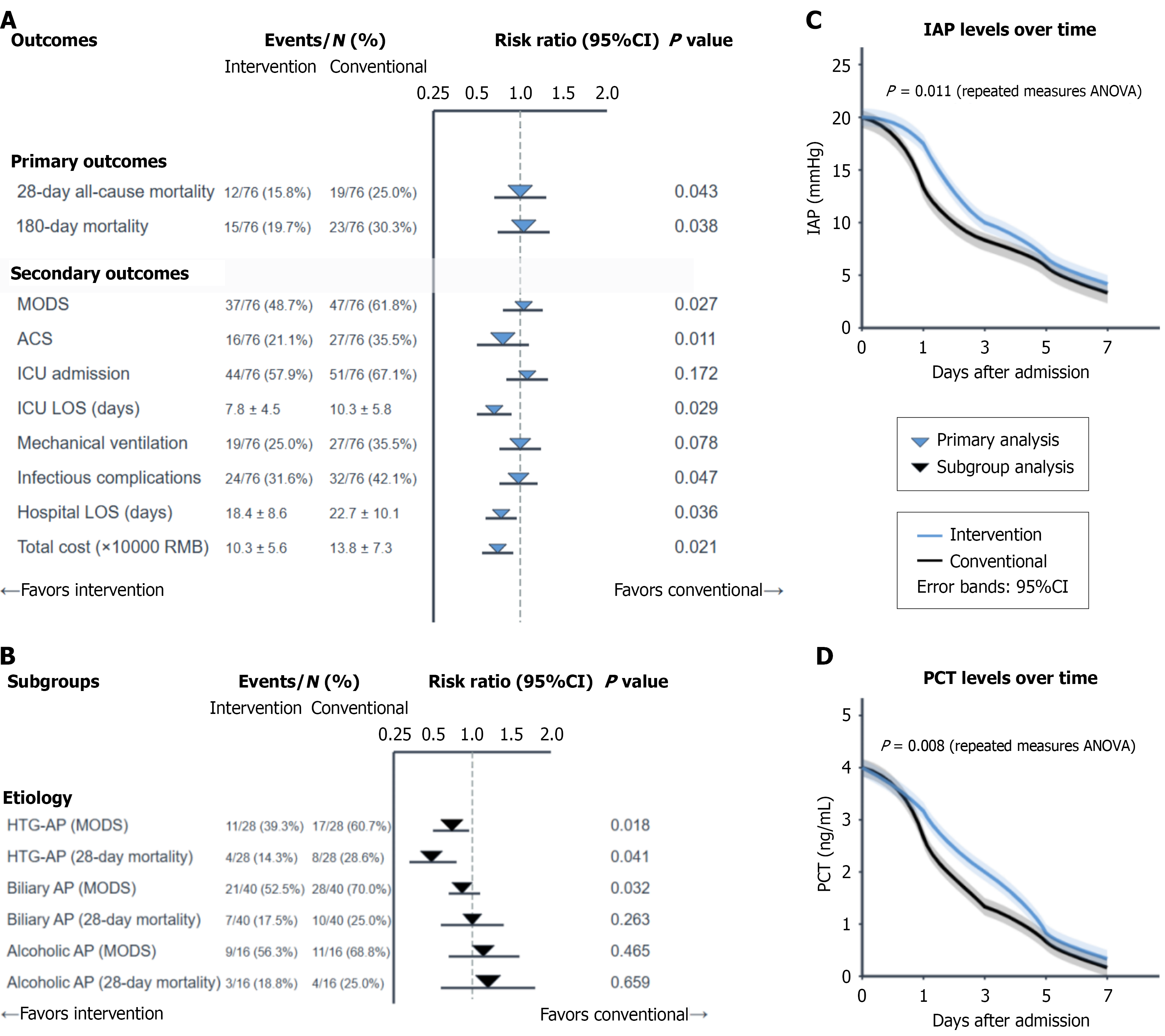 A: Outcomes; B: Subgroups; C: Intra-abdominal pressure levels over time; D: Procalcitonin levels over time. Intra-abdominal pressure-procalcitonin-guided management was associated with lower 28-day mortality (15.8% vs 25.0%, P = 0.043) and multiple organ dysfunction syndrome incidence (48.7% vs 61.8%, P = 0.027). ACS: Abdominal compartment syndrome; AP: Acute pancreatitis; HTG-AP: Hypertriglyceridemic acute pancreatitis; IAP: Intra-abdominal pressure; ICU: Intensive care unit; LOS: Length of stay; MODS: Multiple organ dysfunction syndrome; PCT: Procalcitonin; ANOVA: Analysis of variance; CI: Confidence interval.