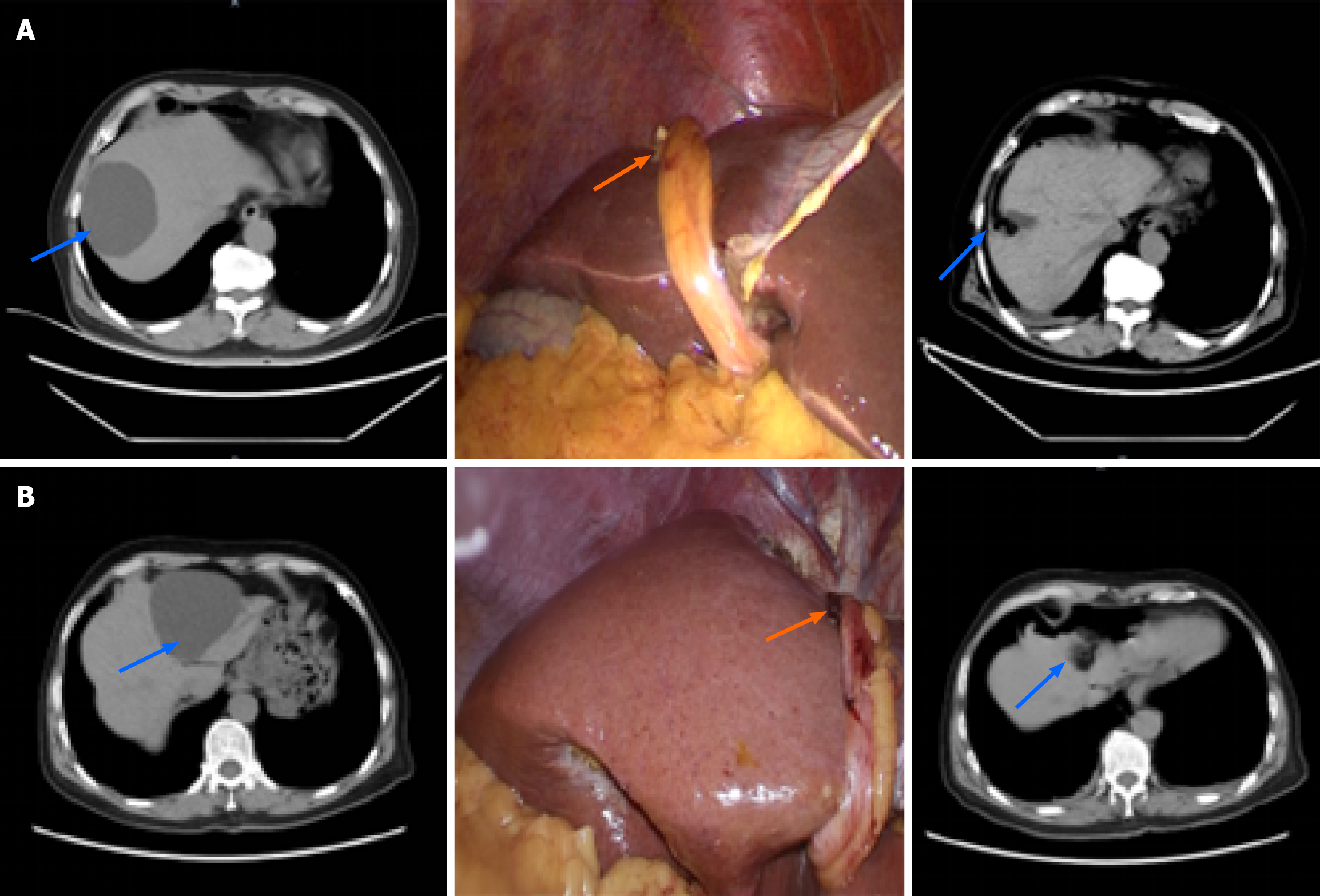 A: A case of a right hepatic cyst. The blue arrow traces the preoperative and one-year postoperative appearance of the hepatic cyst as visualized on computed tomography scans, demonstrating the significant change following surgical intervention. The orange arrow directs attention to the round ligament of the liver, which has been meticulously sutured and anchored to the base of the cyst; B: A case of a left hepatic cyst. The blue arrow shows the preoperative and one-year postoperative computed tomography images, revealing the effective management of the cyst. The orange arrow highlights the round ligament of the liver, which has been skillfully sutured and fixed in place.