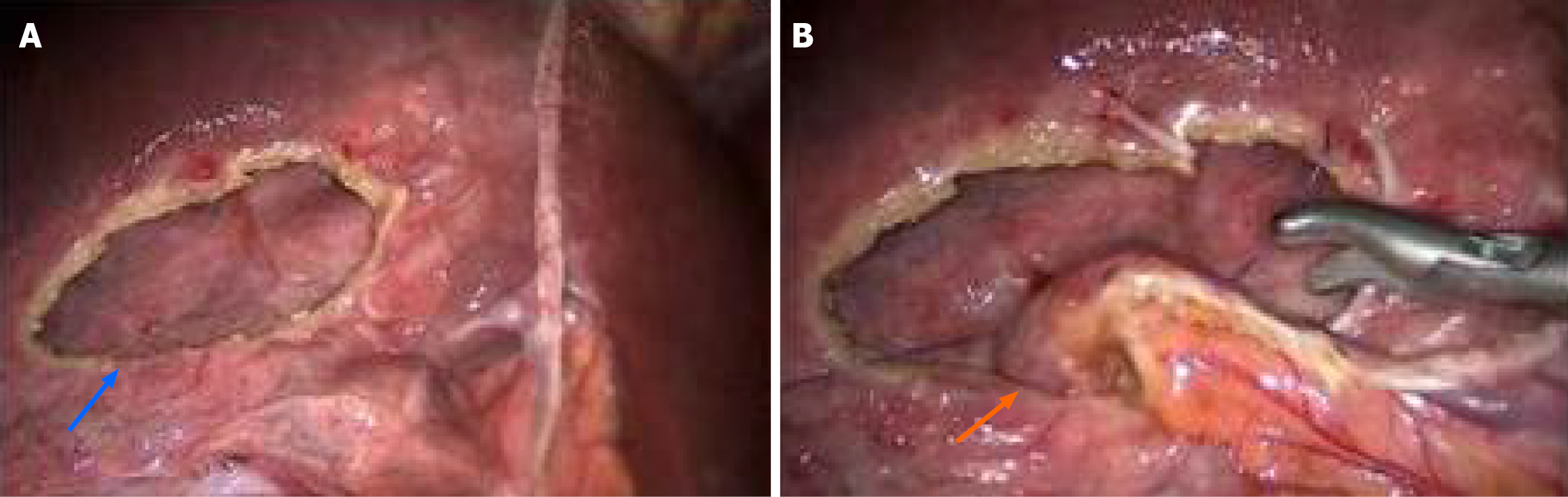 A: Cyst not closed and sutured, and the wound is opened (blue arrow); B: The free hepatic round ligament (orange arrow) is sutured to the bottom of the cyst with 4-0 prolene suture to drain the cyst fluid and prevent the closure of the cyst wall.