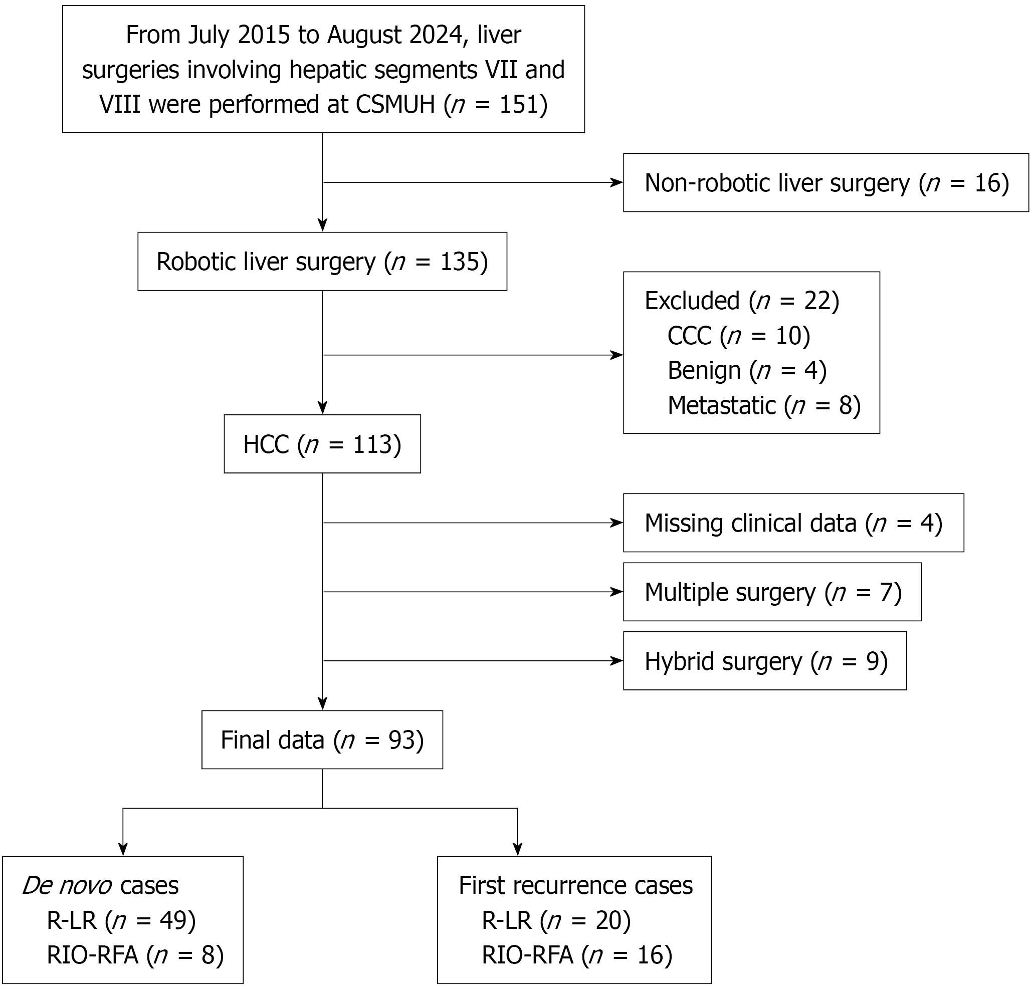 CSMUH: Chung Shan Medical University Hospital; HCC: Hepatocellular carcinoma; R-LR: Robotic liver resection; RIO-RFA: Robotic intraoperative radiofrequency ablation; CCC: Cholangiocarcinoma.