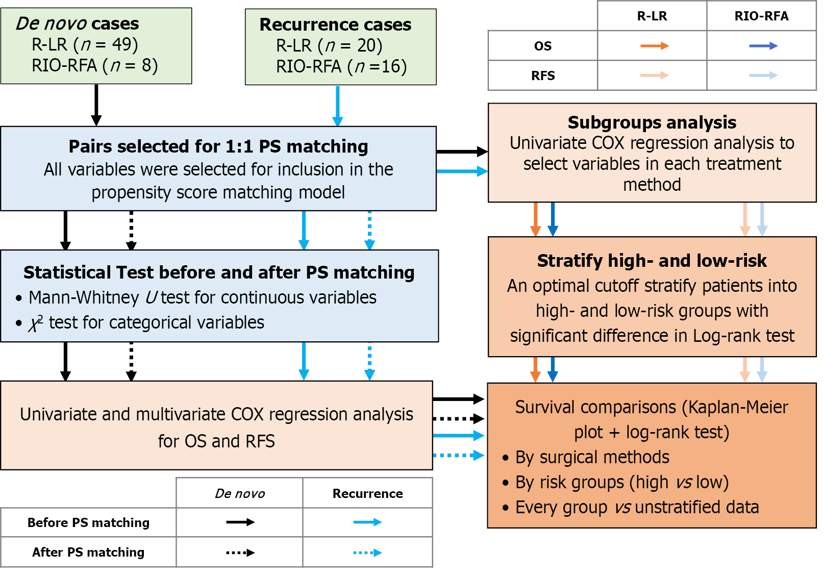 R-LR: Robotic liver resection; RIO-RFA: Robotic intraoperative radiofrequency ablation; PS: Propensity score; OS: Overall survival; RFS: Recurrence-free survival.