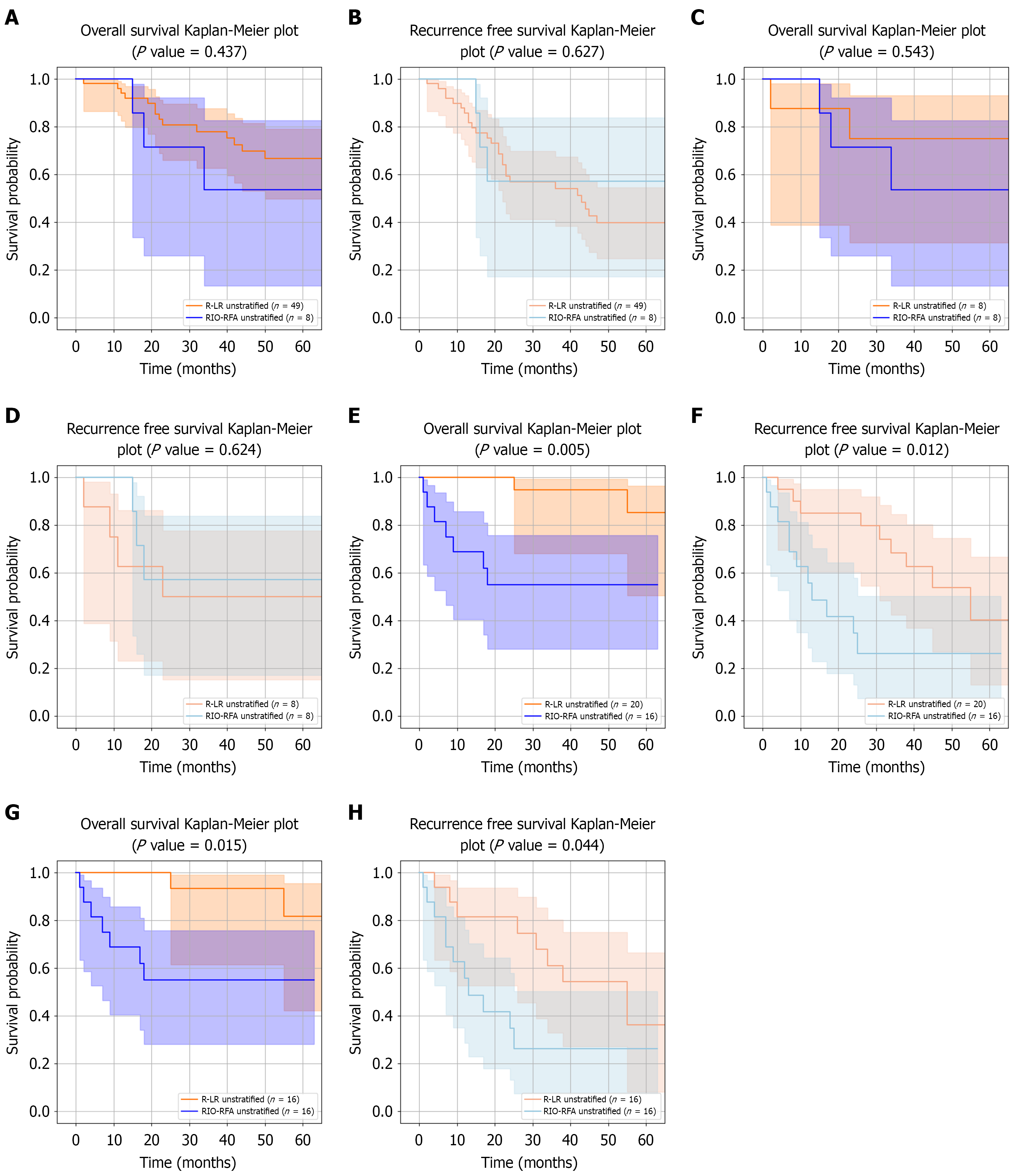 A-D: In the de novo group, before and after propensity score matching. Overall survival (OS) before propensity score (PS) matching (A); RFS before PS matching (B); OS after PS matching (C); RFS after PS matching (D); E-H: In first recurrence group, before and after PS matching. OS before PS matching (E); RFS before PS matching (F); OS after PS matching (G); RFS after PS matching (H). R-LR: Robotic liver resection; RIO-RFA: Robotic intraoperative radiofrequency ablation.