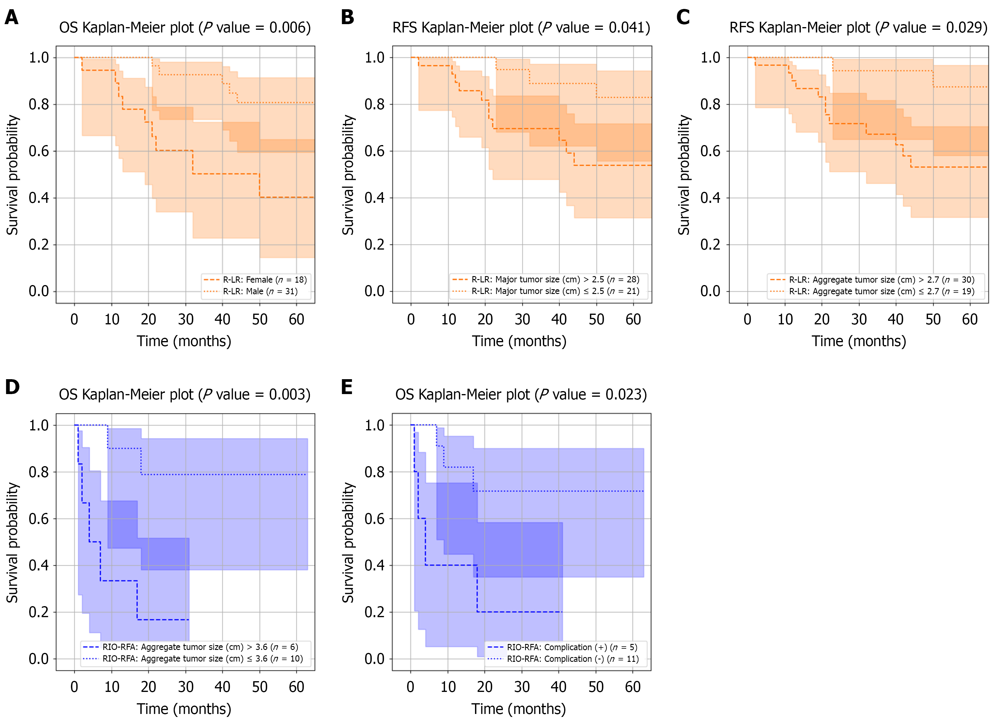 A-C: Within the robotic liver resection group in the de novo group prior to propensity score matching. Patients were stratified into high-risk and low-risk groups based on gender, major tumor size, and aggregate tumor size - variables identified as significantly associated with survival outcomes; D and E: Within the robotic intraoperative radiofrequency ablation group in first recurrence group after propensity score matching. Patients were stratified into high-risk and low-risk groups based on aggregate tumor size and complication or not - variables identified as significantly associated with survival outcomes. OS: Overall survival; RFS: Recurrence-free survival; R-LR: Robotic liver resection; RIO-RFA: Robotic intraoperative radiofrequency ablation.
