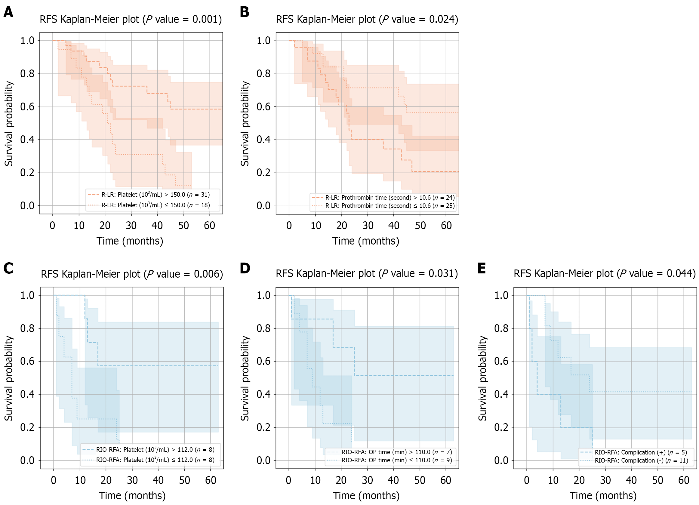 A and B: Within the robotic liver resection group in the de novo group prior to propensity score matching. Patients were stratified into high-risk and low-risk groups based on platelet count and prothrombin time - variables identified as significantly associated with survival outcomes; C-E: Within the robotic intraoperative radiofrequency ablation group in first recurrence group after propensity score matching. Patients were stratified into high-risk and low-risk groups based on platelet count, operation time and complication or not - variables identified as significantly associated with survival outcomes. RFS: Recurrence-free survival; R-LR: Robotic liver resection; RIO-RFA: Robotic intraoperative radiofrequency ablation; OP: Operative procedure.