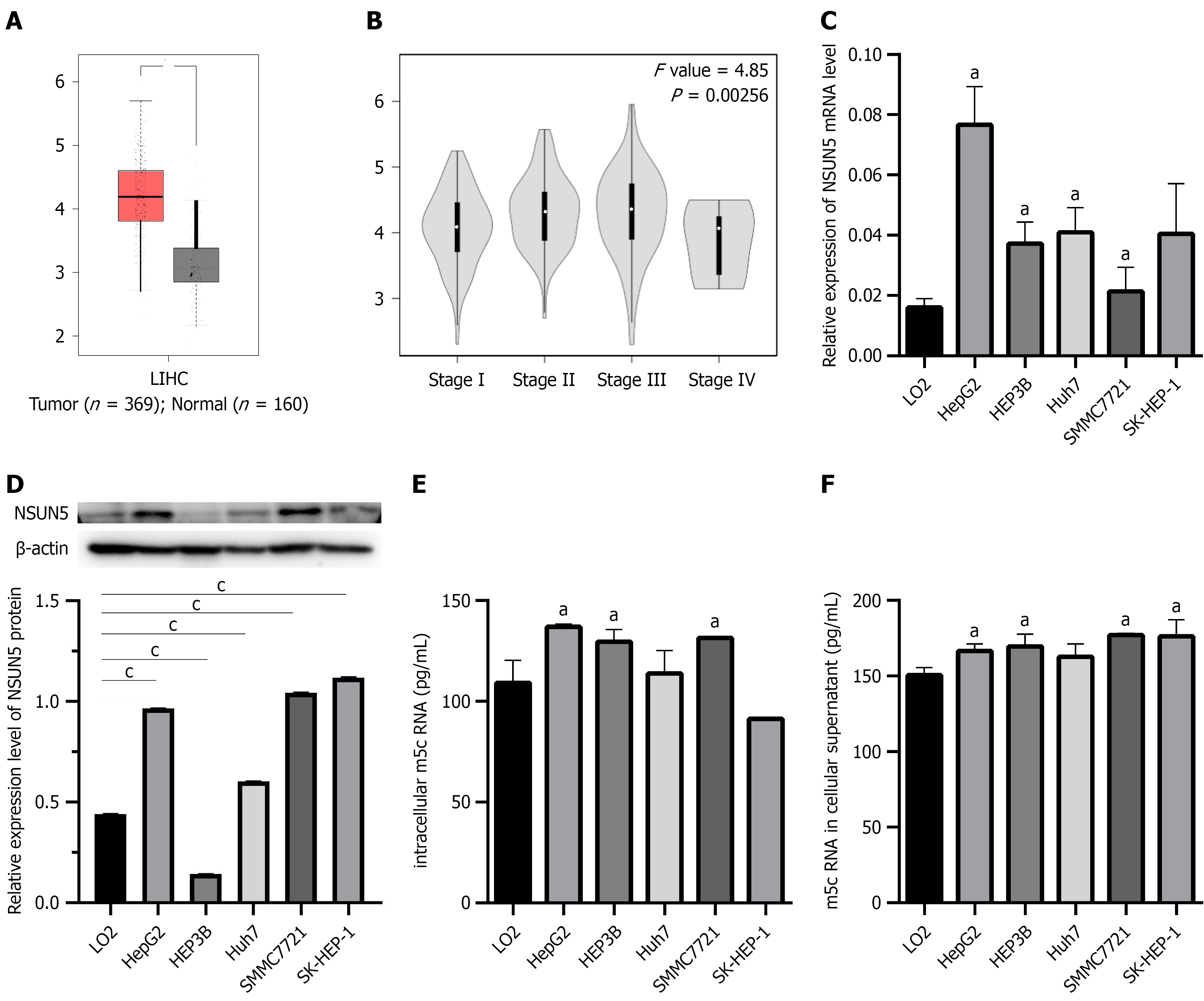 A: NOP2/sun RNA methyl transferase 5 (NSUN5) mRNA expression in hepatocellular carcinoma patients (Gene Expression Profiling Interactive Analysis database, normal tissues are matched The Cancer Genome Atlas adjacent tissue and Genotype-Tissue Expression data); B: Differential NSUN5 mRNA expression levels across different tumor-node-metastasis stages (Gene Expression Profiling Interactive Analysis database); C: NSUN5 mRNA levels across cell lines; D: NSUN5 protein expression across cell lines; E: Intracellular 5-methylcytosine RNA contents; F: The 5-methylcytosine RNA levels in cell culture supernatants. aP < 0.05, cP < 0.001 vs LO2. LIHC: Liver hepatocellular carcinoma; m5c: 5-methylcytosine; NSUN5: NOP2/sun RNA methyltransferase 5.