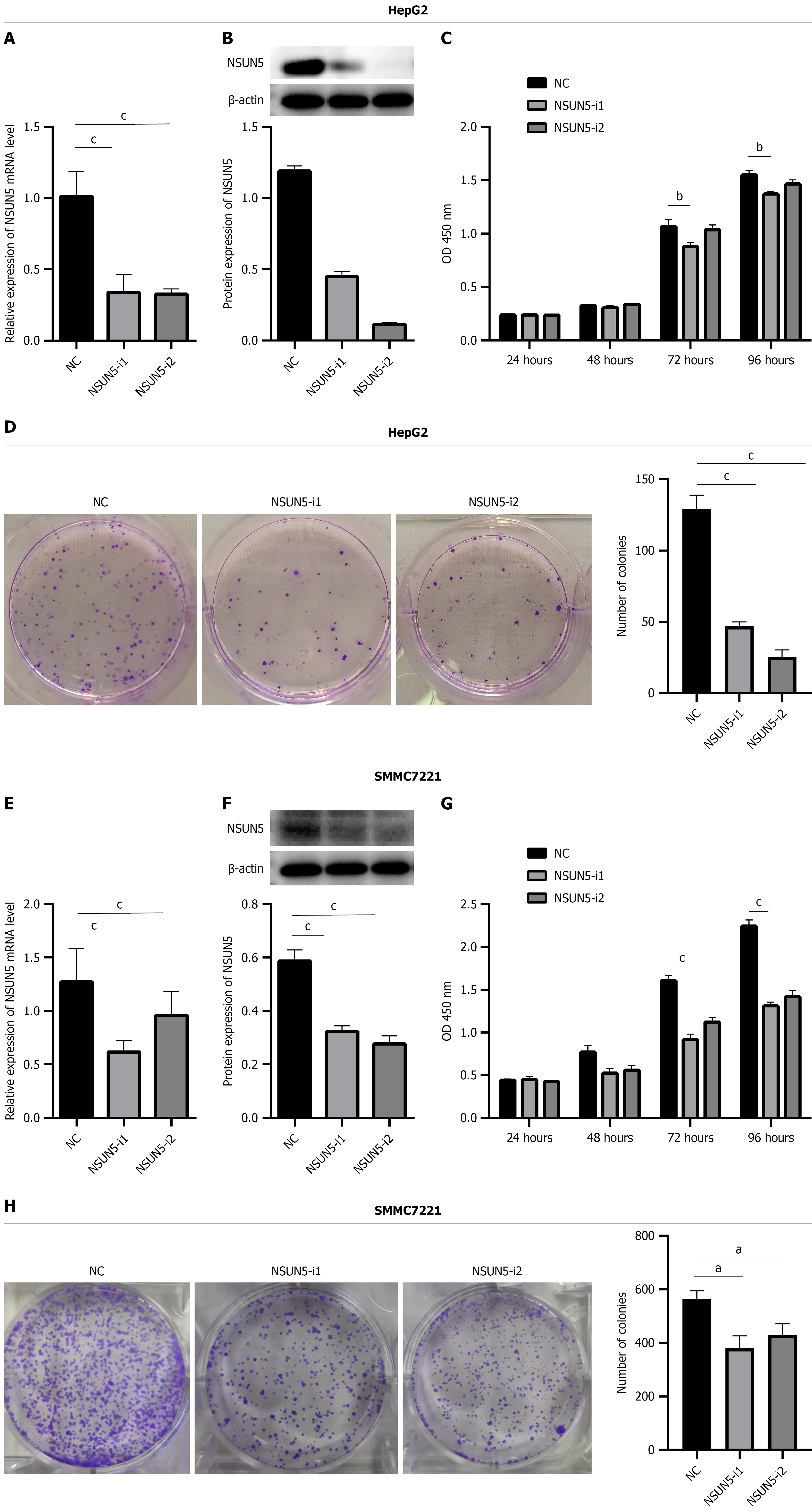 A: NOP2/sun RNA methyltransferase 5 (NSUN5) mRNA expression in HepG2 post-NSUN5 knockdown; B: NSUN5 protein expression in HepG2 post-NSUN5 knockdown; C: HepG2 viability; D: Colony formation ability of HepG2; E: NSUN5 mRNA expression in SMMC-7721; F: NSUN5 protein expression in SMMC-7721; G: SMMC-7721 proliferation capacity; H: Clonogenic potential of SMMC-7721. aP < 0.05, bP < 0.01, cP < 0.001. NC: No control; NSUN5: NOP2/sun RNA methyltransferase 5; OD: Optical density.