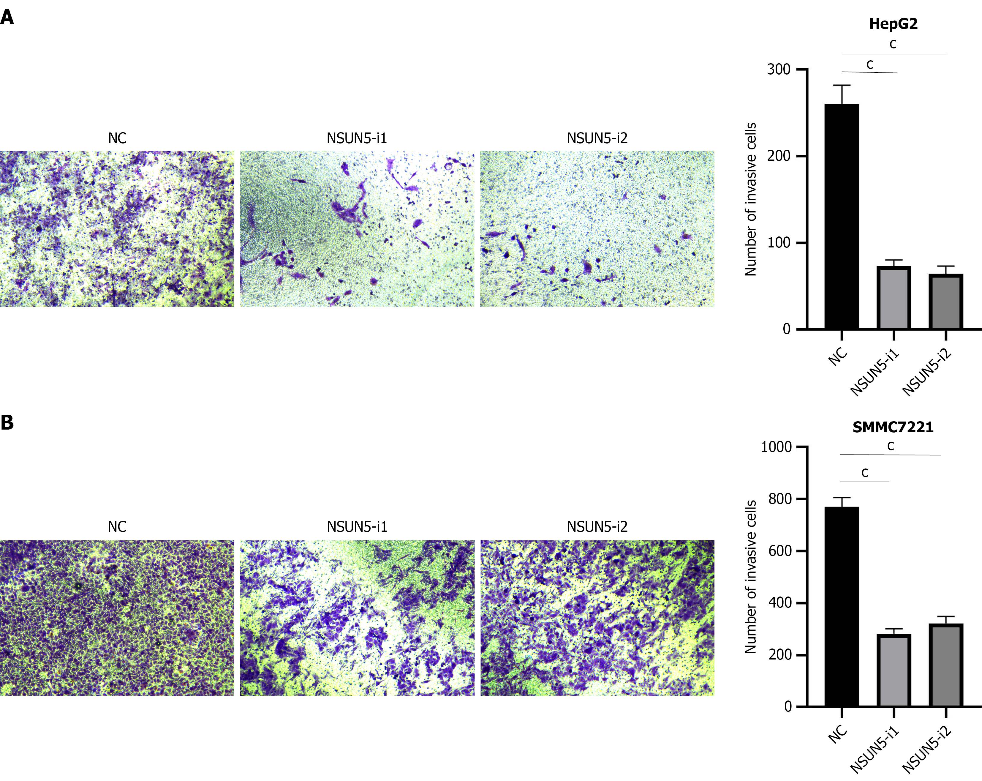 A: Invasive capacity of HepG2 ost-NOP2/sun RNA methyltransferase 5 knockdown; B: Invasion potential of SMMC7721 with NOP2/sun RNA methyltransferase 5 depletion. cP < 0.001. NC: No control; NSUN5: NOP2/sun RNA methyltransferase 5.