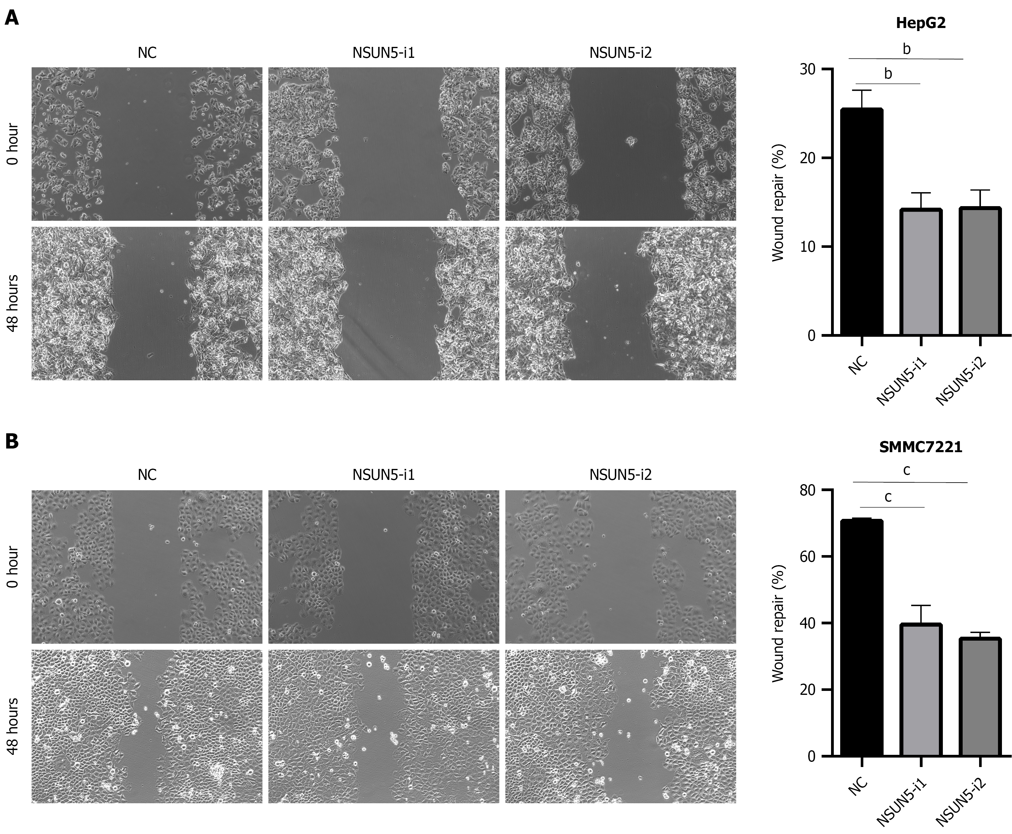 A: HepG2 migration post-NOP2/sun RNA methyltransferase 5 interference; B: SMMC7721 migration upon NOP2/sun RNA methyltransferase 5 depletion. bP < 0.01, cP < 0.001. NC: No control; NSUN5: NOP2/sun RNA methyltransferase 5.