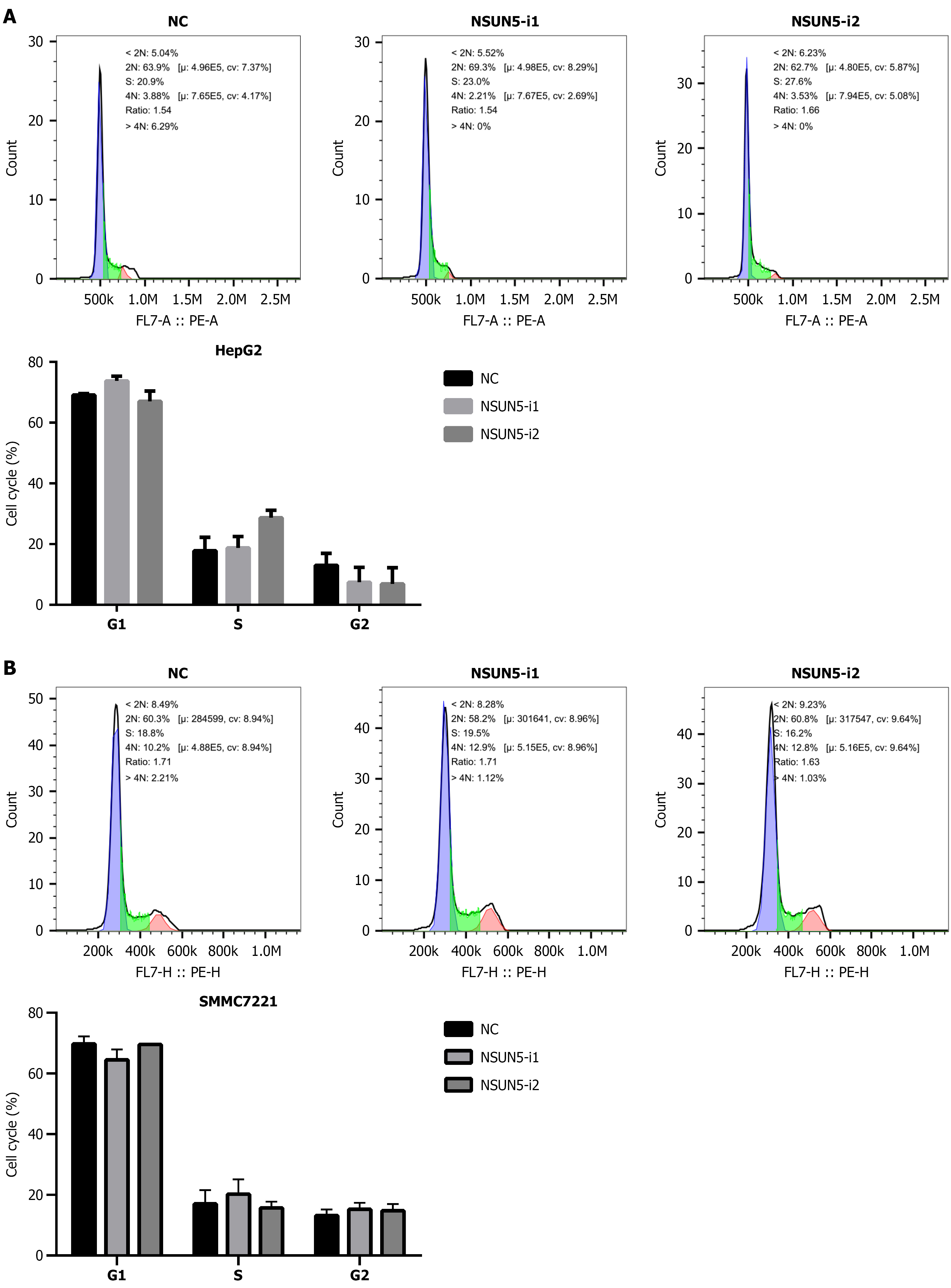 A: Cell cycle distribution in HepG2 following NOP2/sun RNA methyltransferase 5 knockdown; B: Cell cycle profile of SMMC7721 after NOP2/sun RNA methyltransferase 5 interference. NC: No control; NSUN5: NOP2/sun RNA methyltransferase 5.