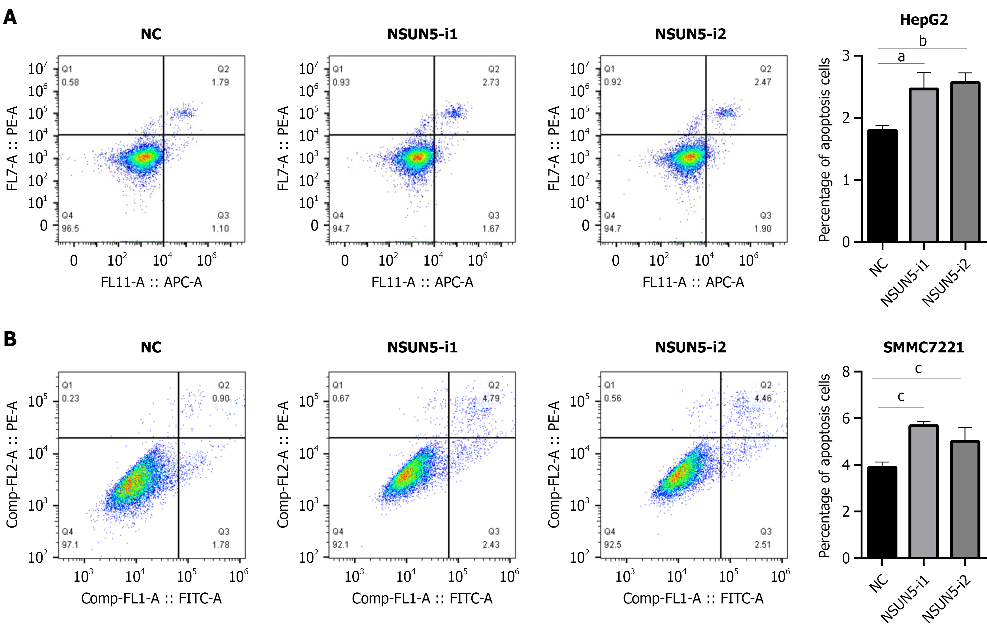 A: HepG2 apoptosis; B: SMMC7721 apoptosis. aP < 0.05, bP < 0.01, cP < 0.001. NC: No control; NSUN5: NOP2/sun RNA methyltransferase 5.