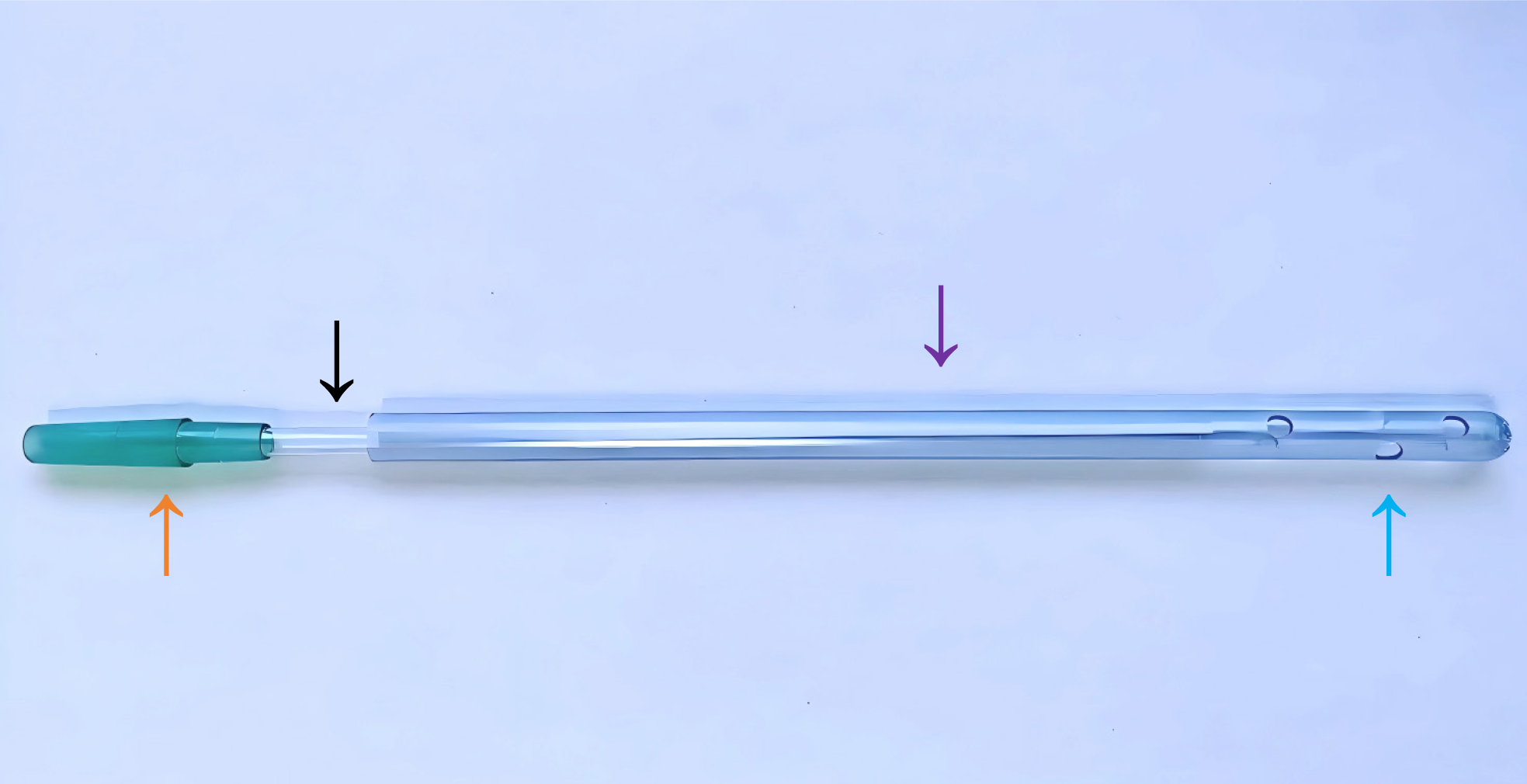 Outer tube (purple arrow), internal tube (orange arrow), and side perforations of the tube (blue arrow); the black arrow indicates the junction where air can enter.