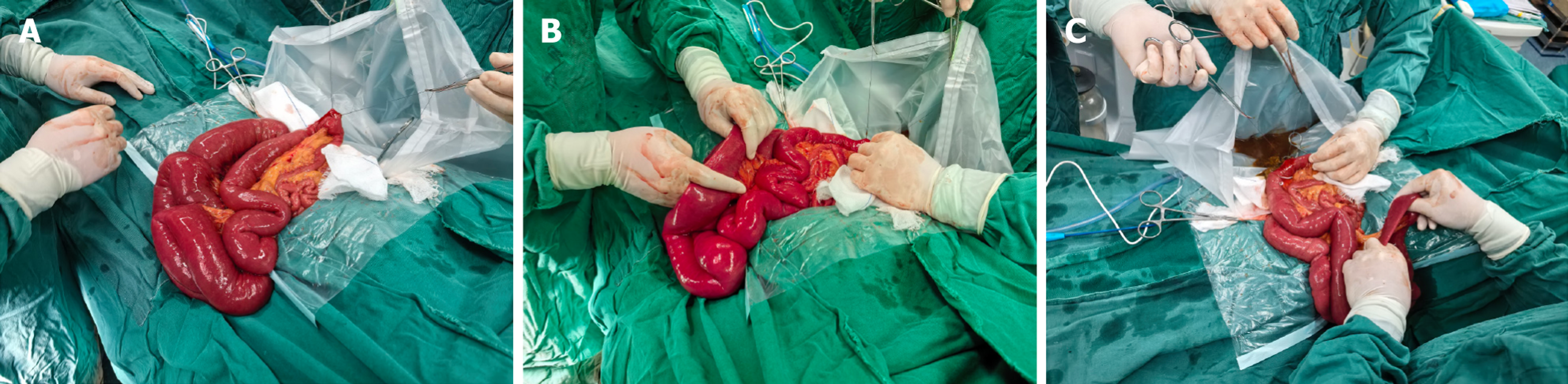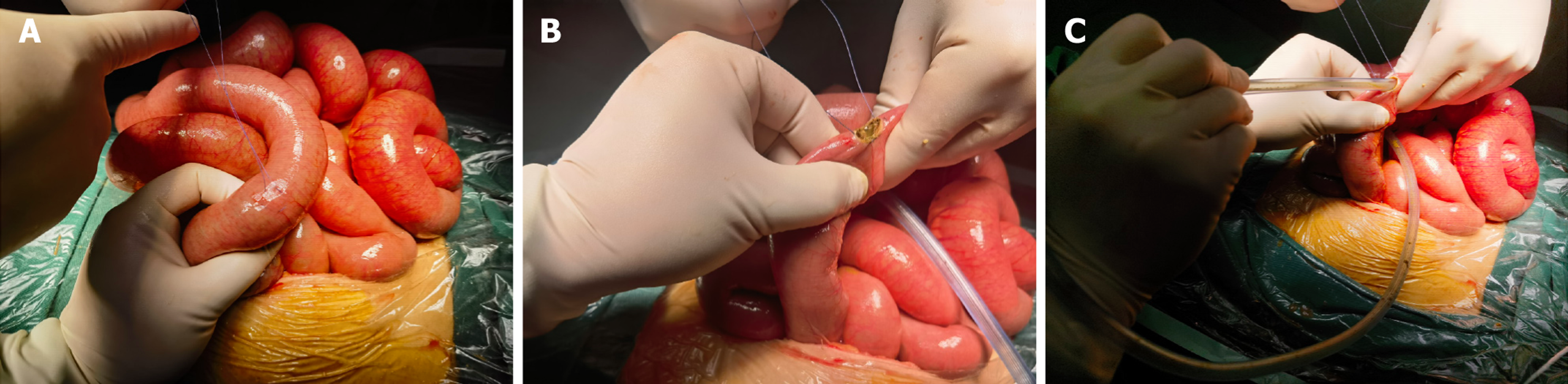 A: A purse-string suture with a diameter of approximately 1 cm was placed on the small intestine wall; B: Fingers were used to control the proximal intestinal tract as the intestinal wall was cut open the; C: The cannula was inserted, and fingers were released to perform the small intestine decompression.
