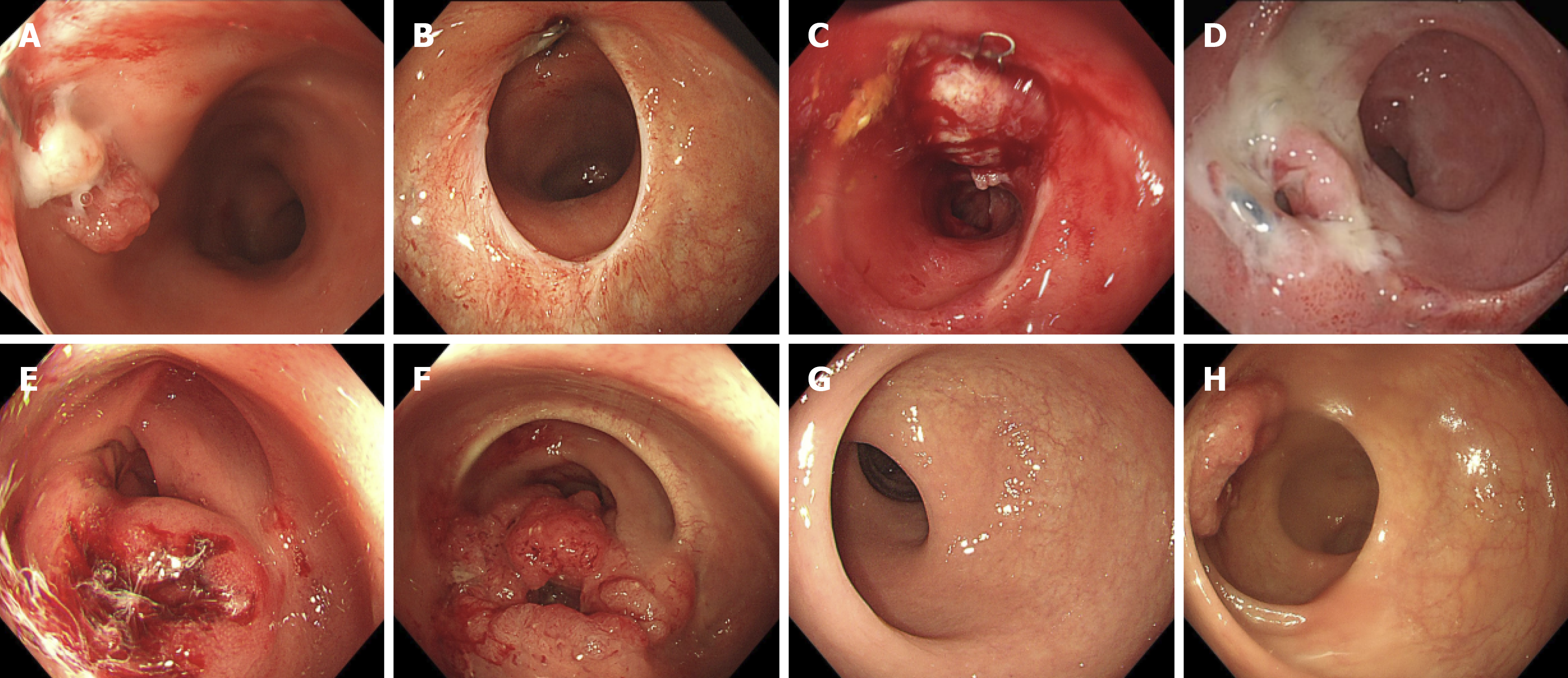 A: Four months after rectal cancer surgery, colonoscopy revealed polypoid changes near the anastomotic site. Post-polypectomy pathology indicated tubular adenoma with high-grade intraepithelial neoplasia; B: Three months after polypectomy, colonoscopy showed no abnormalities; C: Four months later, follow-up colonoscopy confirmed adenocarcinoma at the anastomotic site; D: Five months after rectal cancer surgery, follow-up colonoscopy suggested an anastomotic fistula at the anastomotic site, but no biopsy was performed; E: Two years later, colonoscopy indicated swelling of the anastomotic mucosa with undetermined nature; biopsy pathology revealed moderate chronic mucosal inflammation; F: Nine months later, follow-up colonoscopy confirmed adenocarcinoma at the anastomotic site; G: During the initial colonoscopy, no lesions were identified in the rectum; H: Two years later, repeat colonoscopy confirmed adenocarcinoma in the rectum.