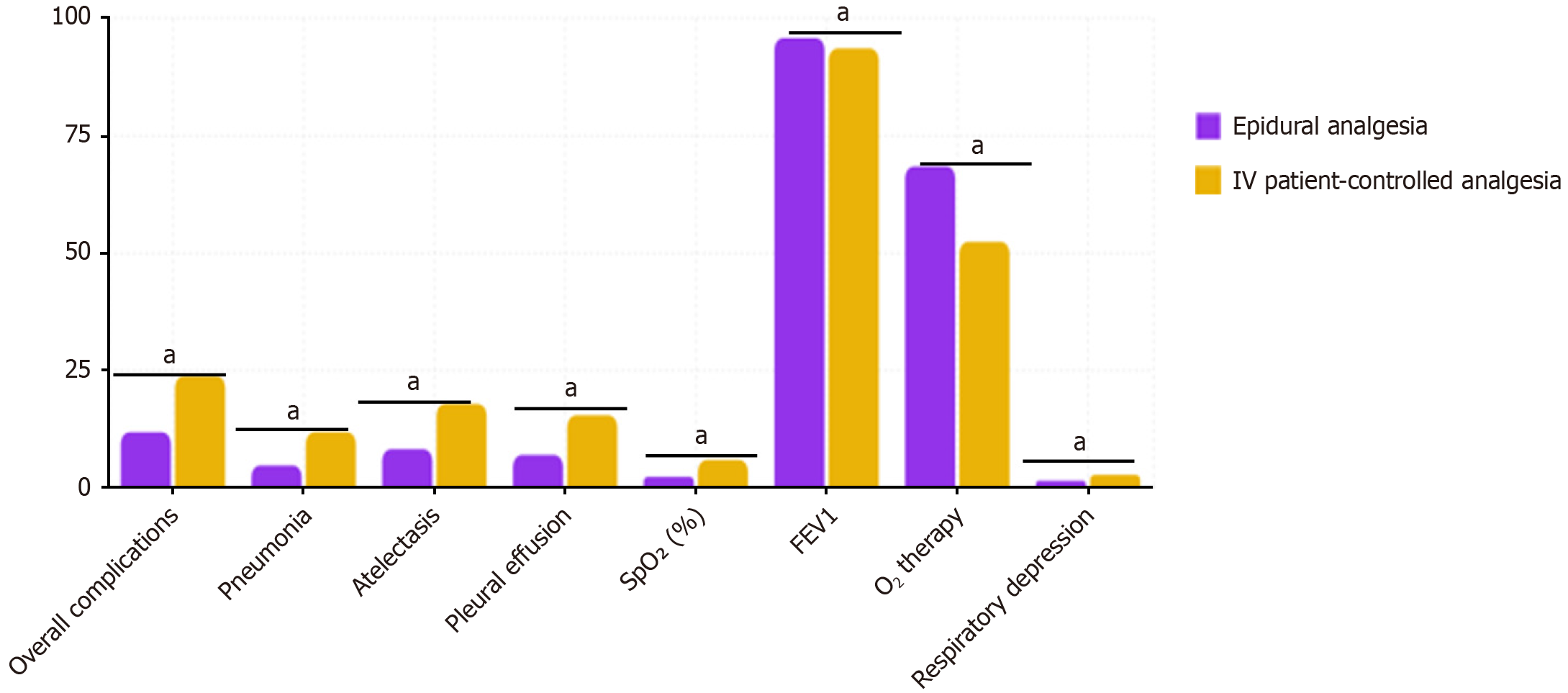 Significantly lower rates across all categories for the epidural anesthesia group compared to the intravenous patient-controlled analgesia group: Overall complications: 11.9% vs 23.8% (aP = 0.042); pneumonia: 4.8% vs 11.9% (aP = 0.038); Atelectasis: 8.3% vs 17.9% (aP = 0.022); pleural effusion: 7.1% vs 15.5% (aP = 0.046); respiratory function parameters. Better outcomes in the epidural anesthesia group: Higher SpO2 levels: 95.8% vs 93.6% (aP < 0.001); better forced expiratory volume in 1 second values: 68.5% vs 52.4% of preoperative values (aP < 0.001); shorter supplemental oxygen therapy: 1.6 days vs 2.8 days (aP < 0.001); lower respiratory depression rates: 2.4% vs 6.0% (aP = 0.246, not statistically significant). EA: Epidural anesthesia; IVPCA: Intravenous patient-controlled analgesia; FEV1: Forced expiratory volume in 1 second.