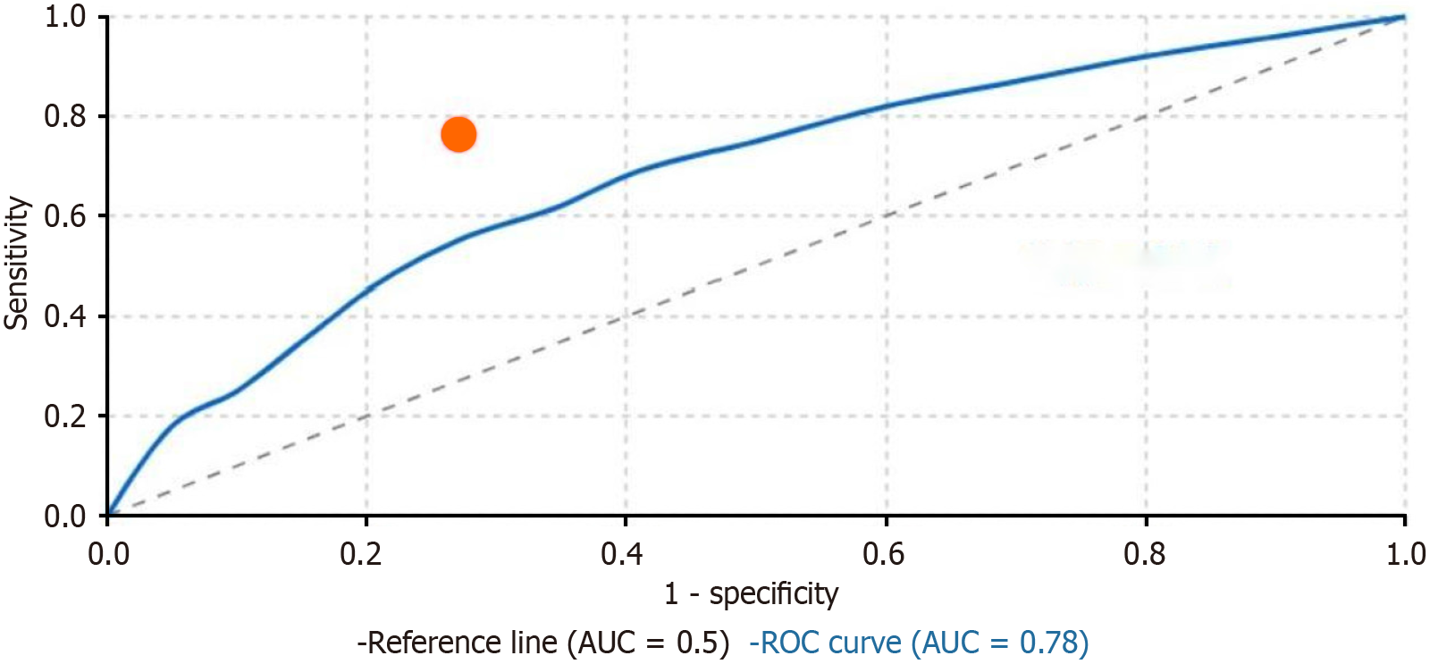 The receiver operating characteristic curve analysis demonstrated that 24-hour movement-evoked pain scores effectively predicted delayed hospital discharge (> 15 days) with good discriminatory ability (Area under the curve = 0.78, 95% confidence interval: 0.71-0.85, P < 0.001). A Visual Analog Scale pain score threshold of ≥ 5, with sensitivity of 76.3% and specificity of 72.9%, was identified as the optimal cutoff for predicting prolonged hospitalization, with significantly fewer epidural anesthesia patients exceeding this threshold compared to intravenous patient-controlled analgesia patients (18.7% vs 65.2%, P < 0.001). ROC: Receiver operating characteristic; AUC: Area under the curve.