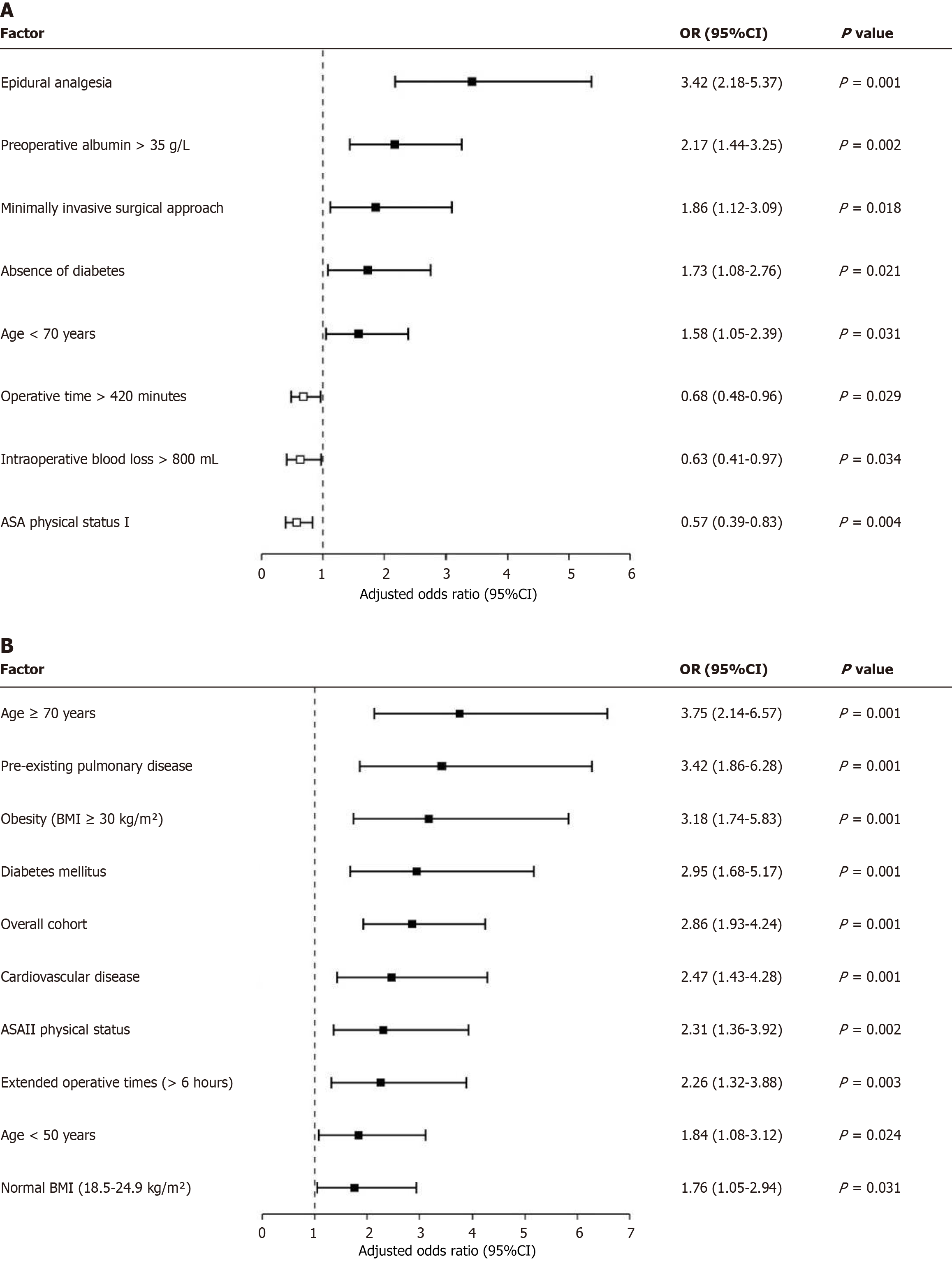 A: Forest plot of predictors for favorable postoperative recovery. This forest plot illustrates independent predictors of favorable postoperative recovery, with epidural analgesia being the strongest positive predictor [adjusted odds ratios (OR) = 3.42] and American Society of Anesthesiologists physical status III being the most significant negative predictor (adjusted OR = 0.57). The visualization clearly distinguishes between factors promoting recovery (OR > 1) and those hindering recovery (OR < 1) through point estimates and 95% confidence intervals, effectively demonstrating the strength and statistical significance of each factor’s influence; B: Forest plot of epidural analgesia benefits by subgroup. The forest plot displays adjusted odds ratios with 95% confidence intervals for epidural analgesia benefits across different patient subgroups, revealing that elderly patients (age ≥ 70) derive the greatest benefit (odds ratios = 3.75) while younger patients and those with normal body mass index show more modest yet still significant improvements. This visualization effectively demonstrates that epidural analgesia provides statistically significant advantages for optimal recovery across all analyzed subgroups, with particularly pronounced benefits in high-risk populations, including those with pre-existing pulmonary disease, obesity, and diabetes mellitus. OR: Odds ratios; CI: Confidence interval.