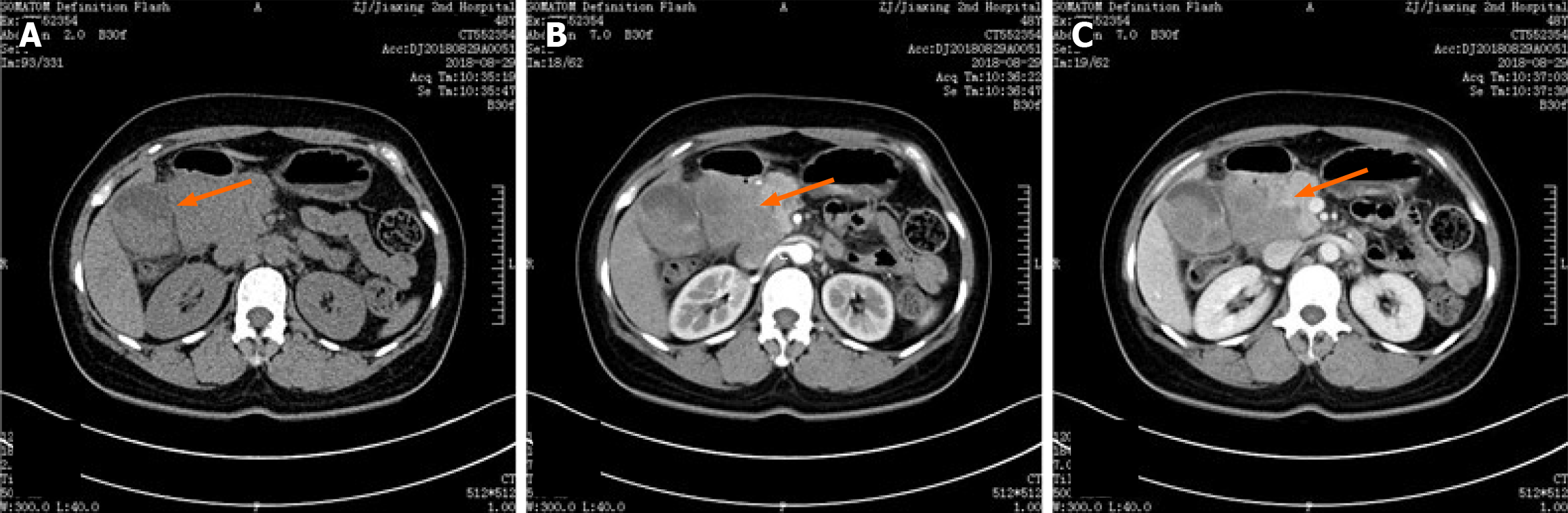 A: Plain pattern; B: Arterial enhancement pattern; C: Enous enhancement pattern.