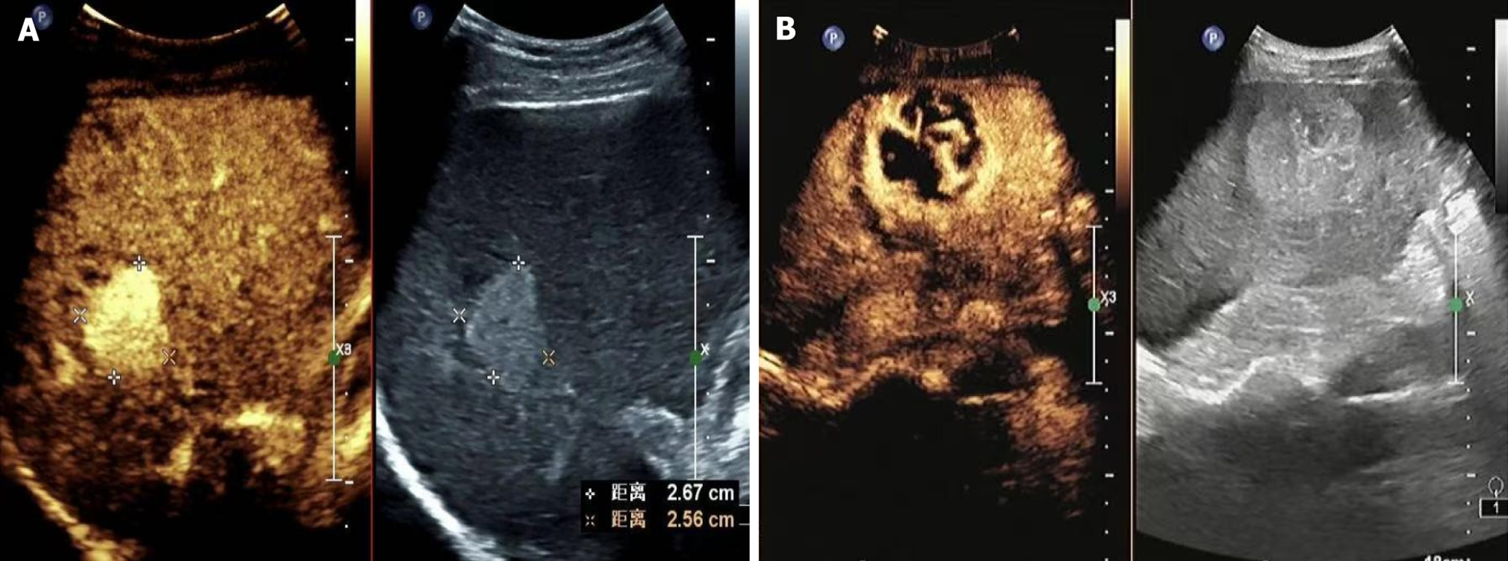 A: Good prognosis. After contrast injection, the mass showed rapid and homogeneous enhancement in the arterial phase; B: Poor prognosis. A hyperechoic mass in the right lobe of the liver was examined using contrast-enhanced ultrasound. After contrast injection, the mass showed rapid and heterogeneous enhancement in the arterial phase, with peripheral ring-like and internal grid-like enhancements.