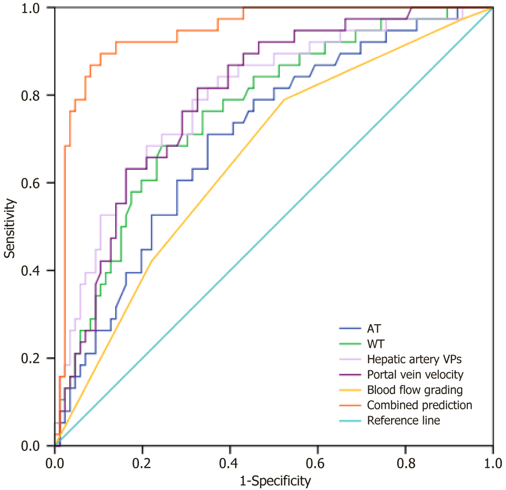 Figure 2 Receiver operating characteristic curve of contrast-enhanced ultrasound combined with Doppler ultrasound parameters in pre dicting the prognosis of hepatocellular carcinoma patients after transcatheter arterial chemoembolization.
