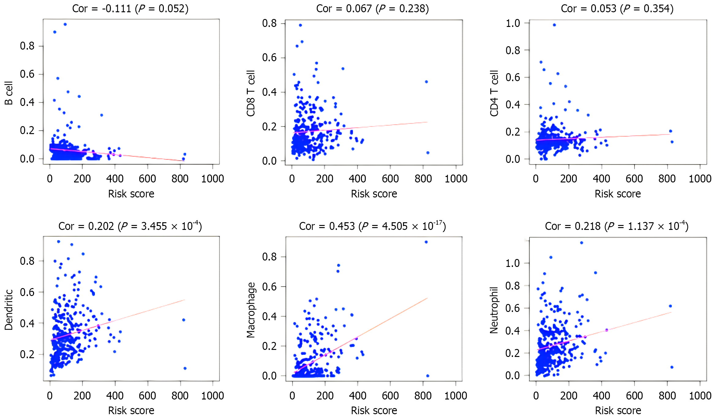 Correlation analysis between risk score and immune cell infiltration levels. Scatter plots displaying the correlations between risk score (X-axis) and the abundance of six immune cell types (Y-axis). CD8+ T cells (correlation coefficient = 0.411, P = 3.052 × 10-18); CD4+ T cells (correlation coefficient = 0.587, P = 6.238 × 10-40), cancer-associated fibroblasts (correlation coefficient = 0.683, P = 3.354 × 10-58), dendritic cells (correlation coefficient = 0.302, P = 3.455 × 10-10), tumor-associated macrophages (correlation coefficient = 0.453, P = 5.05 × 10-22), and neutrophils (correlation coefficient = 0.218, P = × 10-5). All immune cell types showed significant positive correlations with risk score, with cancer-associated fibroblasts demonstrating the strongest correlation. Each dot represents an individual sample, and the gray shaded area indicates the 95% confidence interval of the regression line. Cor: Correlation coefficient.