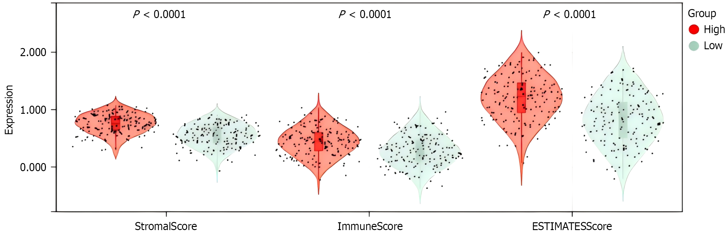 Comparison of tumor microenvironment scores between high-risk and low-risk groups. Violin plots showing the distribution differences between the high-risk group (red) and low-risk group (green) across three scoring metrics: StromalScore, ImmuneScore, and ESTIMATEScore. All three scores showed statistically significant differences between the two groups (P < 0.0001), with the high-risk group exhibiting significantly higher stromal infiltration, immune infiltration, and overall tumor microenvironment scores compared to the low-risk group. The violin shapes display the distribution density of the data, with internal scatter points representing the actual score values for individual samples.