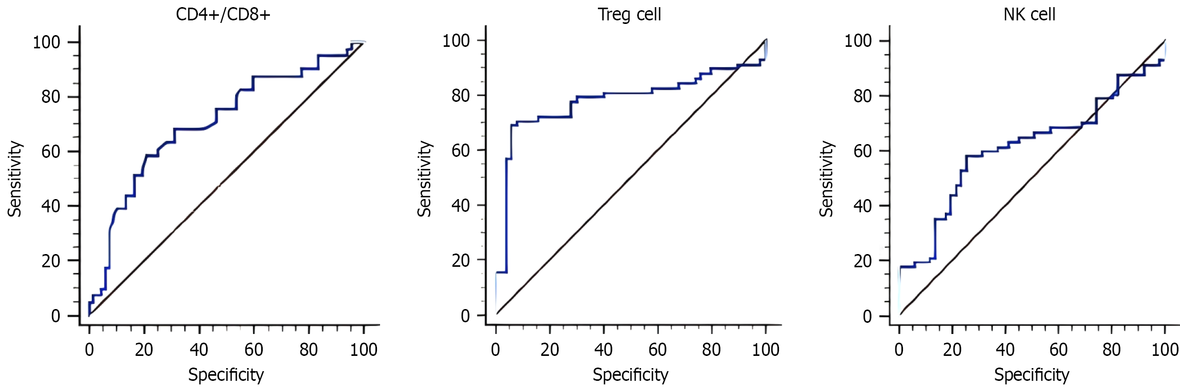 Receiver operating characteristic curves evaluating the predictive performance of immune cell infiltration levels. Three receiver operating characteristic curves are shown for CD4+/CD8+ T cell ratio, Treg cells, and natural killer cells in predicting patient outcomes or risk stratification. The diagonal reference line represents random chance (area under the curve = 0.5). The curves demonstrate the sensitivity (true positive rate, Y-axis) vs specificity (false positive rate, X-axis) across different threshold values. The deviation of each curve from the diagonal line indicates the discriminatory power of the respective immune cell marker in the prediction model. NK: Natural killer.