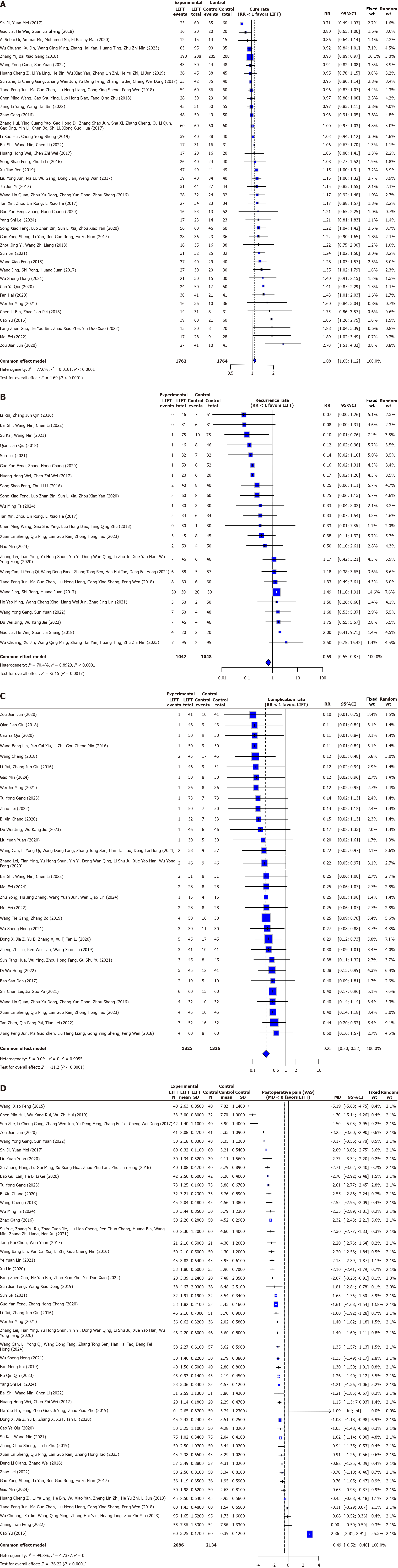 A: Cure rate. Forest plot depicting pooled relative risk (RR) of cure following ligation of the intersphincteric fistula tract (LIFT) vs conventional surgery, with 95% confidence intervals (CIs). Each square represents an individual study estimate, and the diamond indicates the overall pooled effect; B: Recurrence rate. Forest plot depicting the pooled RR for recurrence between LIFT and conventional surgery, with 95%CIs. A lower RR indicates reduced recurrence in the LIFT group; C: Complication rate. Forest plot comparing the complication rates between LIFT and conventional surgery. The pooled RR and 95%CIs demonstrate the safety profile of LIFT; D: Postoperative pain. Forest plot of pooled mean differences in the postoperative pain scores (Visual Analog Scale) between LIFT and conventional surgery, with 95%CIs. Negative values favor LIFT. LIFT: Ligation of the intersphincteric fistula tract; CI: Confidence intervals; RR: Relative risk.