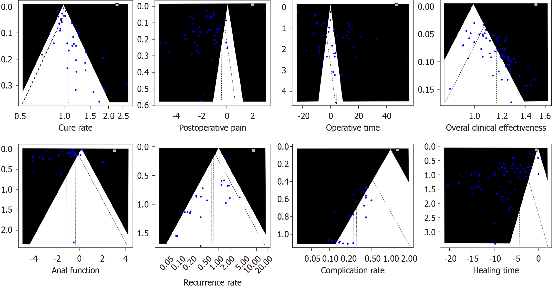 Funnel plots evaluating the potential publication bias across the following eight outcomes: Healing time, postoperative pain, operative time, overall clinical effectiveness, anal function, recurrence rate, complication rate, and cure rate. Symmetrical distributions suggest no significant risk of publication bias.