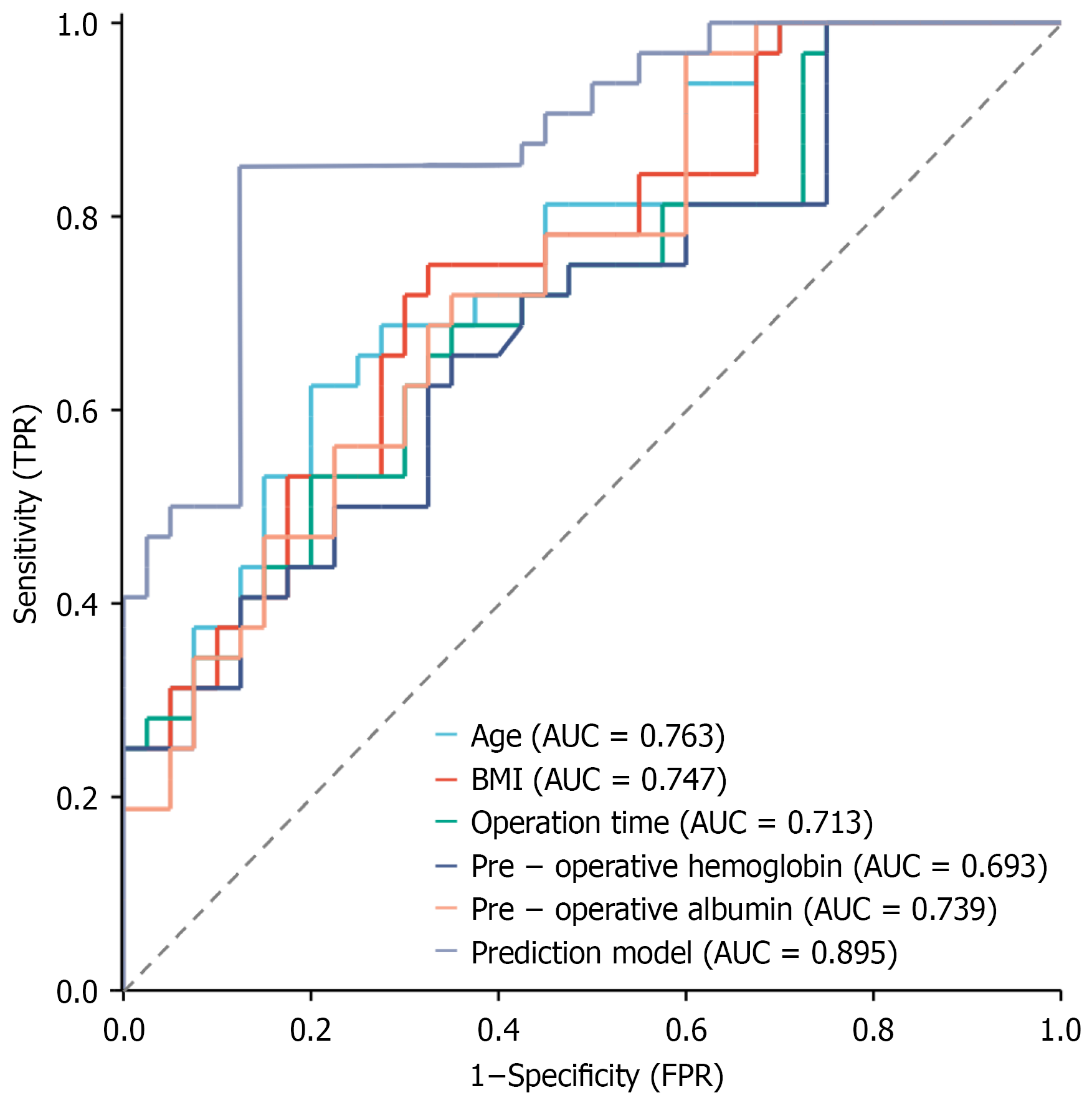 AUC: Area under the receiver operating characteristic curve; BMI: Body mass index; TPR: True positive rate; FPR: False positive rate.