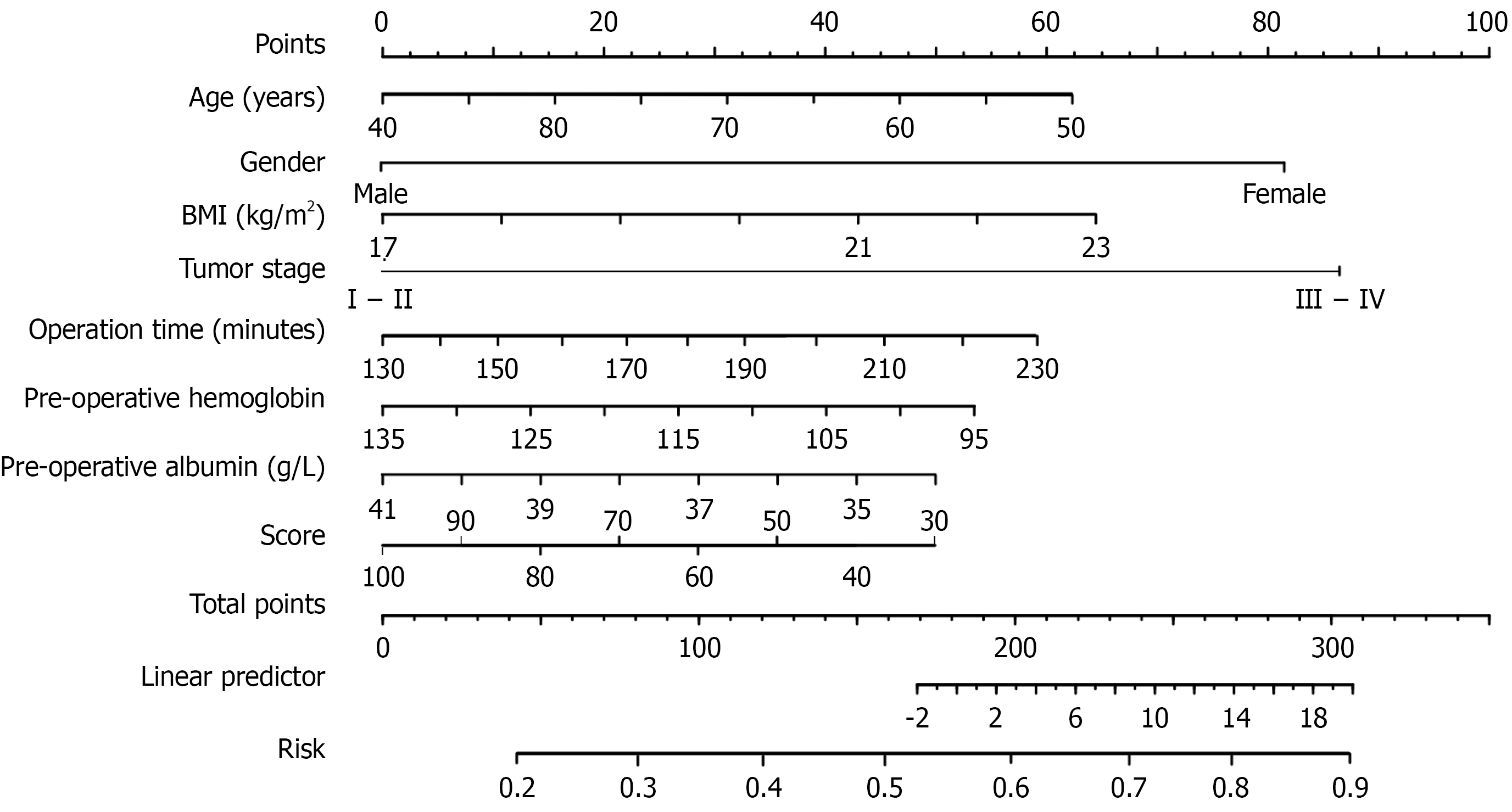 Figure 2 Nomogram for predicting postoperative gastrointestinal dysfunction in patients with gastrointestinal tumors.