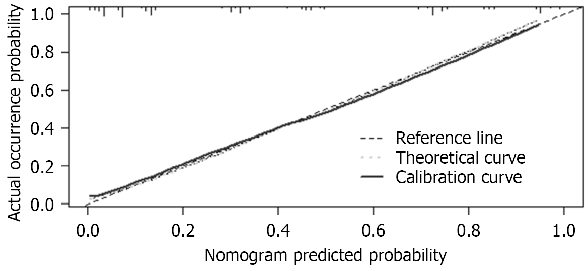 Figure 1 Bias-corrected calibration curve of the nomogram prediction model.