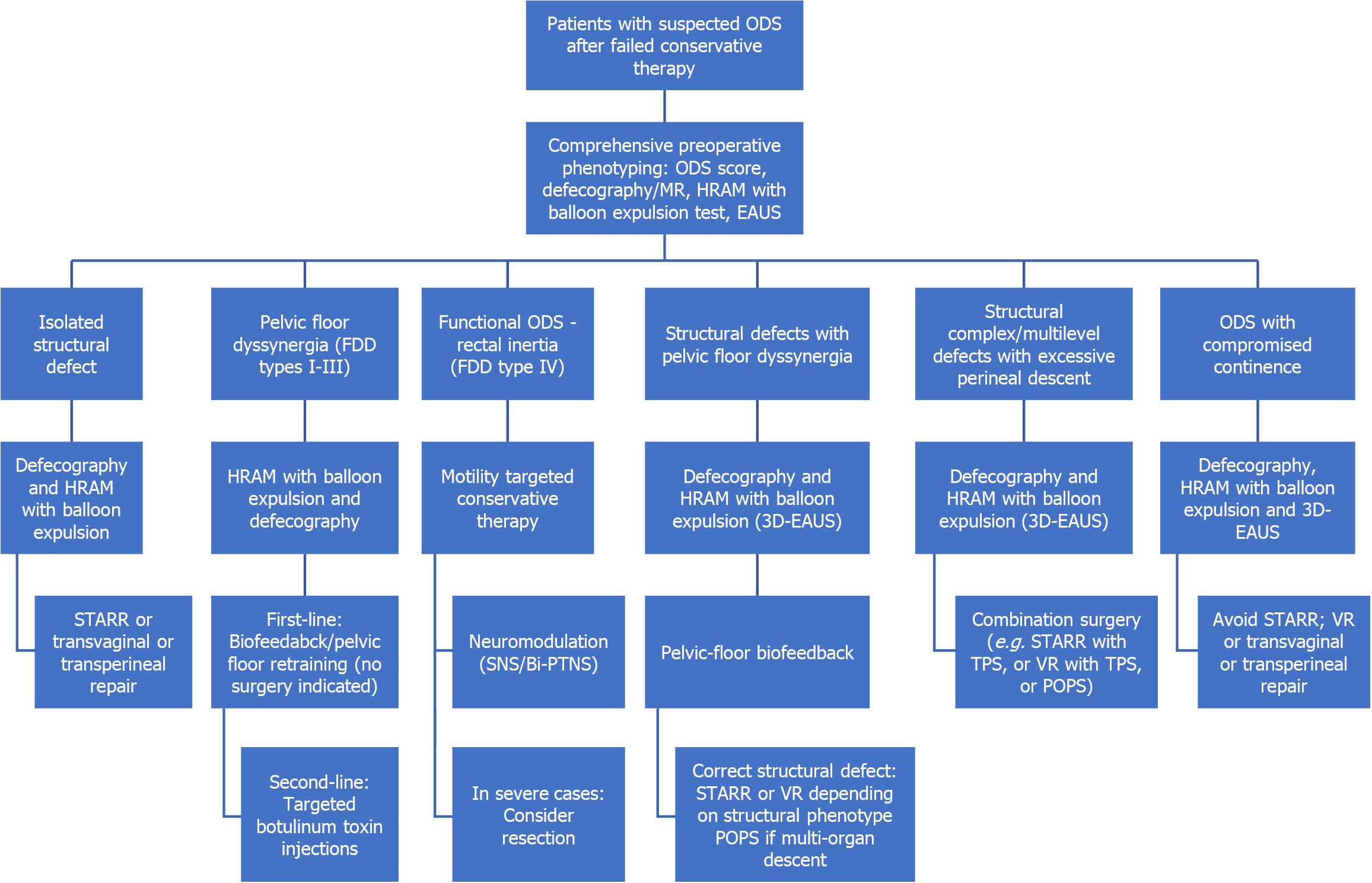 This algorithm stratifies patients with obstructed defecation syndrome into distinct anatomical and functional phenotypes to guide optimal intervention. Structural phenotypes include isolated anatomical defects, complex multi-compartment prolapse, and high-grade internal intussusception. Functional phenotypes comprise functional defecatory disorders (FDD) types I-IV, based on high-resolution anorectal manometry patterns and balloon expulsion testing. Mixed phenotypes incorporate both anatomical obstruction and pelvic floor dyssynergia. For each subtype, the algorithm outlines preferred first-line and second-line interventions, including stapled transanal rectal resection, ventral rectopexy, pelvic organ prolapse suspension, targeted biofeedback, botulinum toxin for refractory dyssynergia, neuromodulation strategies (sacral neuromodulation, bilateral percutaneous tibial nerve stimulation), and transverse perineal support. The figure highlights the critical principle that suspensive procedures should be avoided in rectal inertia (FDD type IV), where inadequate rectal propulsive pressure is the dominant pathophysiology. ODS: Obstructed defecation syndrome; MR: Magnetic resonance; EAUS: Endoanal ultrasound; HRAM: High-resolution anorectal manometry; STARR: Stapled transanal rectal resection; FDD: Functional defecatory disorder; SNS: Sacral neuromodulation; Bi-PTNS: Bilateral percutaneous tibial nerve stimulation; 3D: Three dimensional; VR: Ventral rectopexy; POPS: Pelvic organ prolapse suspension; TPS: Transverse perineal support.
