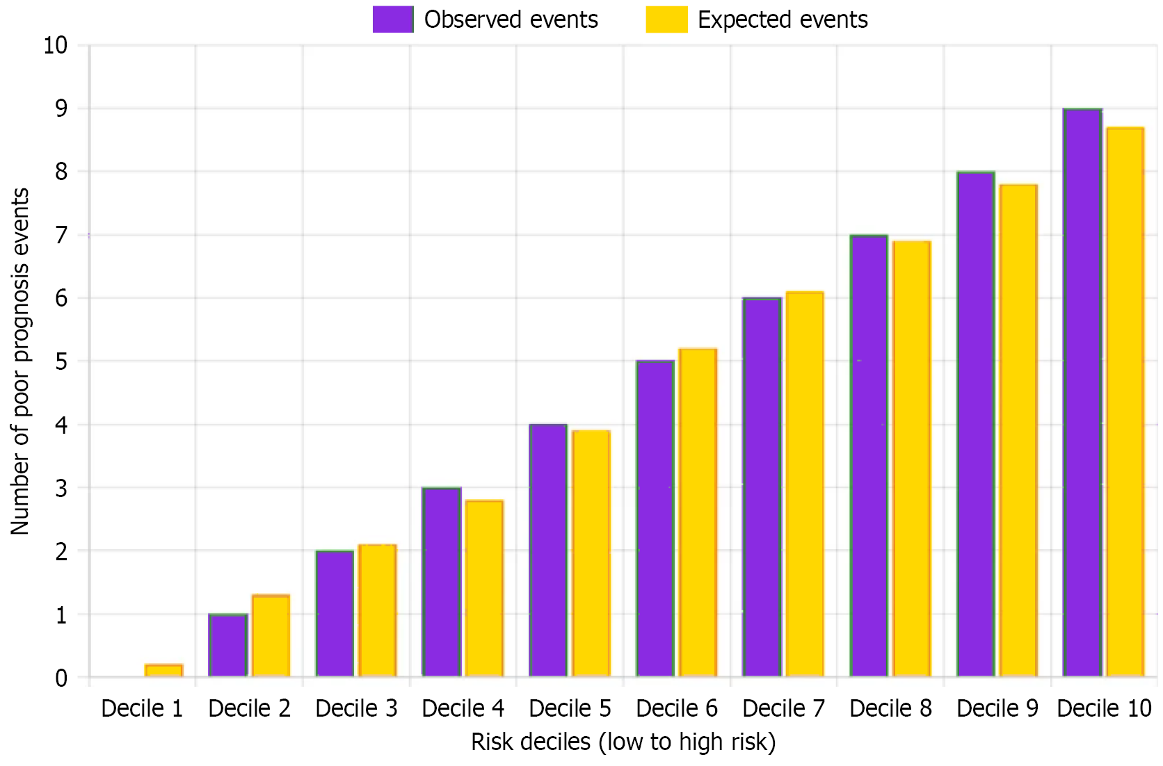 Figure 1 Hosmer-Lemeshow goodness-of-fit test for model calibration: Comparison of observed vs expected events across risk deciles.