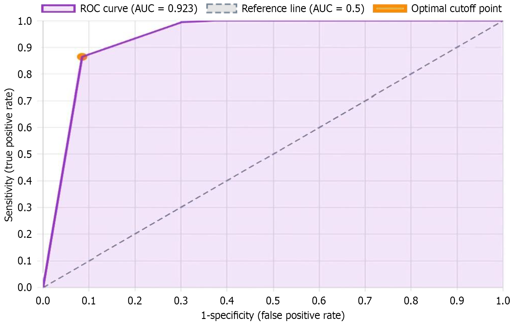 The purple curve demonstrates model discrimination performance with an area under the curve of 0.923, indicating excellent predictive accuracy. The diagonal dashed line represents random chance (area under the curve = 0.5). The orange point marks the optimal cutoff threshold that maximizes the balance between sensitivity (true positive rate, Y-axis) and specificity (1 minus false positive rate, X-axis) for clinical risk classification. ROC: Receiver operating characteristic; AUC: Area under the curve.