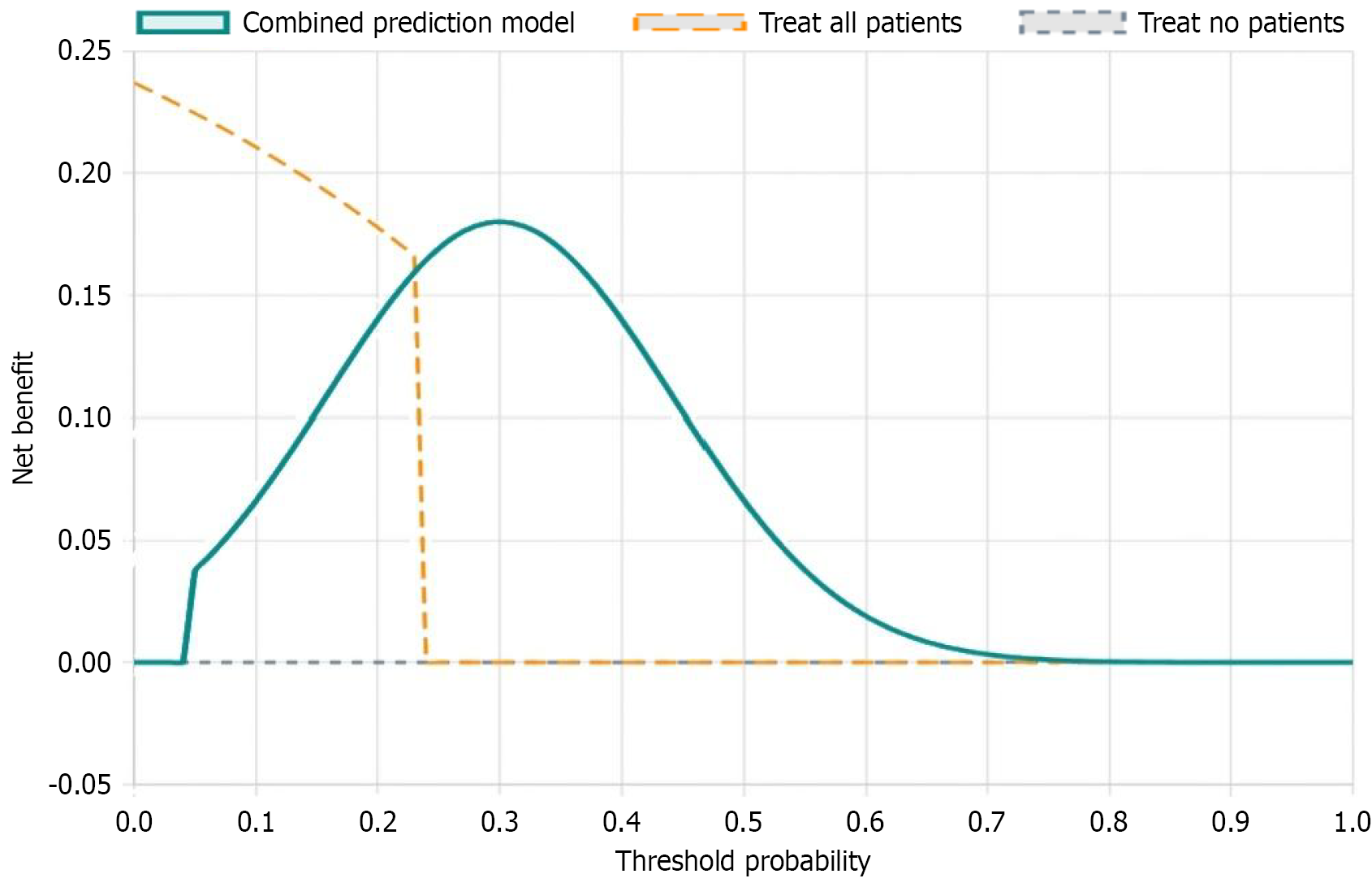 The teal curve represents the net benefit (Y-axis) of using the prediction model to guide treatment decisions across different threshold probabilities (X-axis). The orange dashed line shows the strategy of treating all patients, while the gray dashed line represents treating no patients. The model demonstrates positive net benefit compared to both default strategies across threshold probabilities ranging from approximately 0.05 to 0.65, with peak net benefit observed at a threshold probability of about 0.25, indicating substantial clinical value for risk-based decision making.