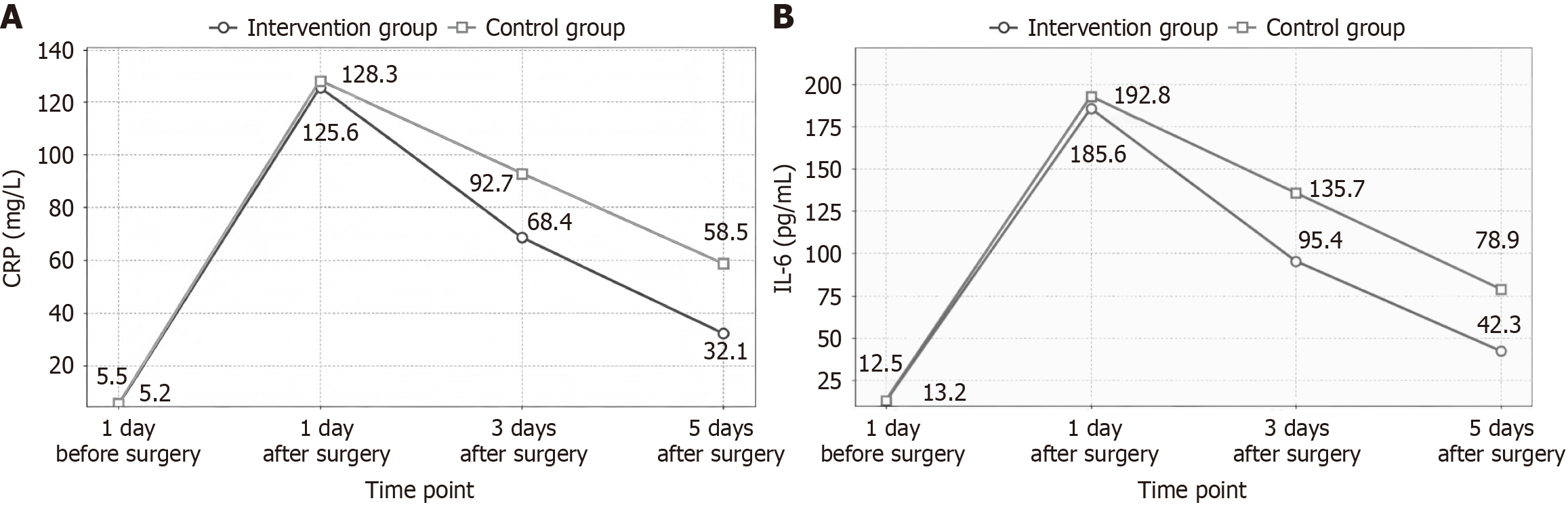 Figure 2 Trends in serum C-reactive protein and interleukin-6 levels before and after surgery in two patient groups.