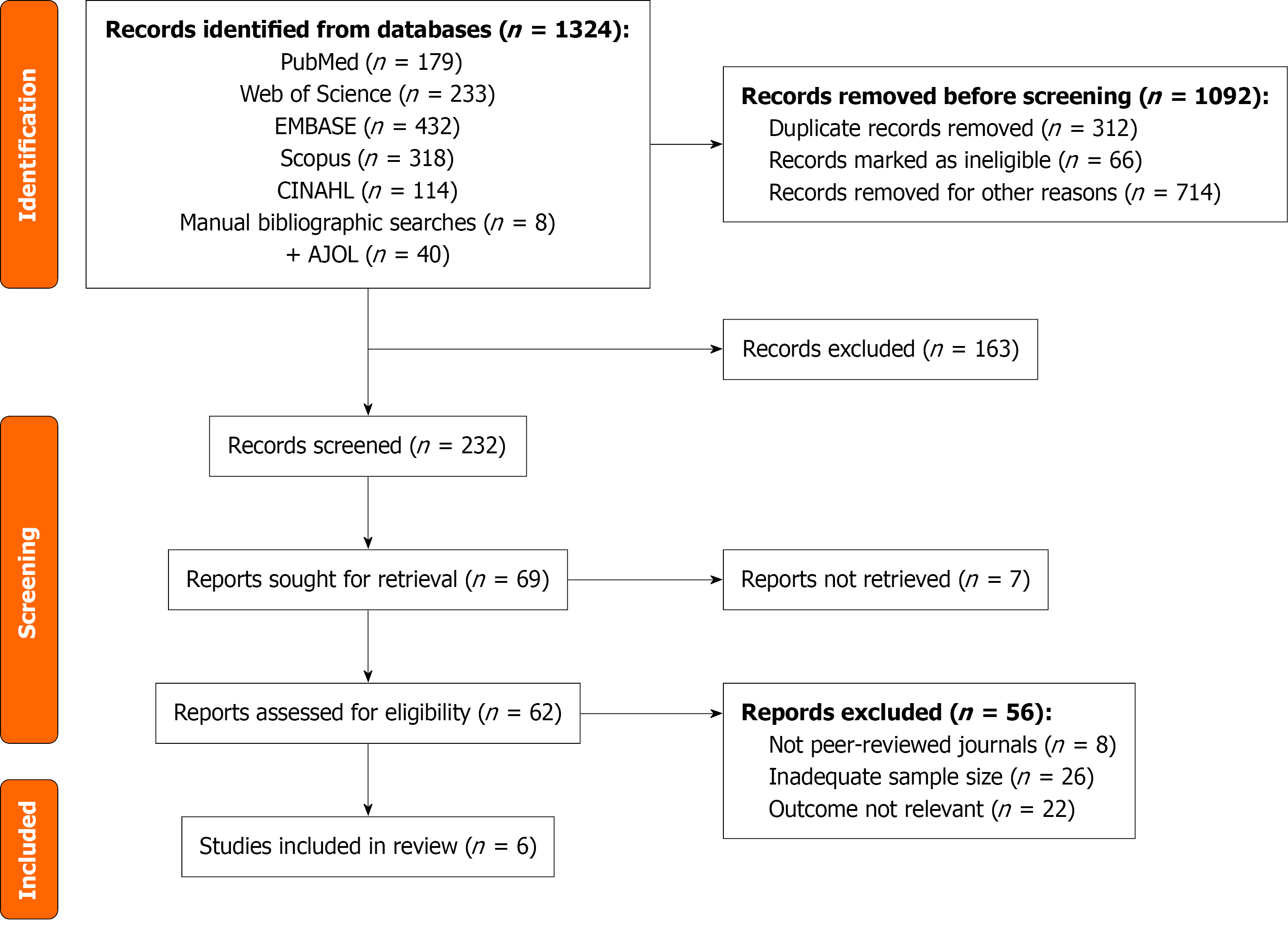 Flowchart showing the identification, screening, eligibility assessment, and final inclusion of studies in the systematic review and meta-analysis according to Preferred Reporting Items for Systematic reviews and Meta-Analyses guidelines. AJOL: African Journals Online.