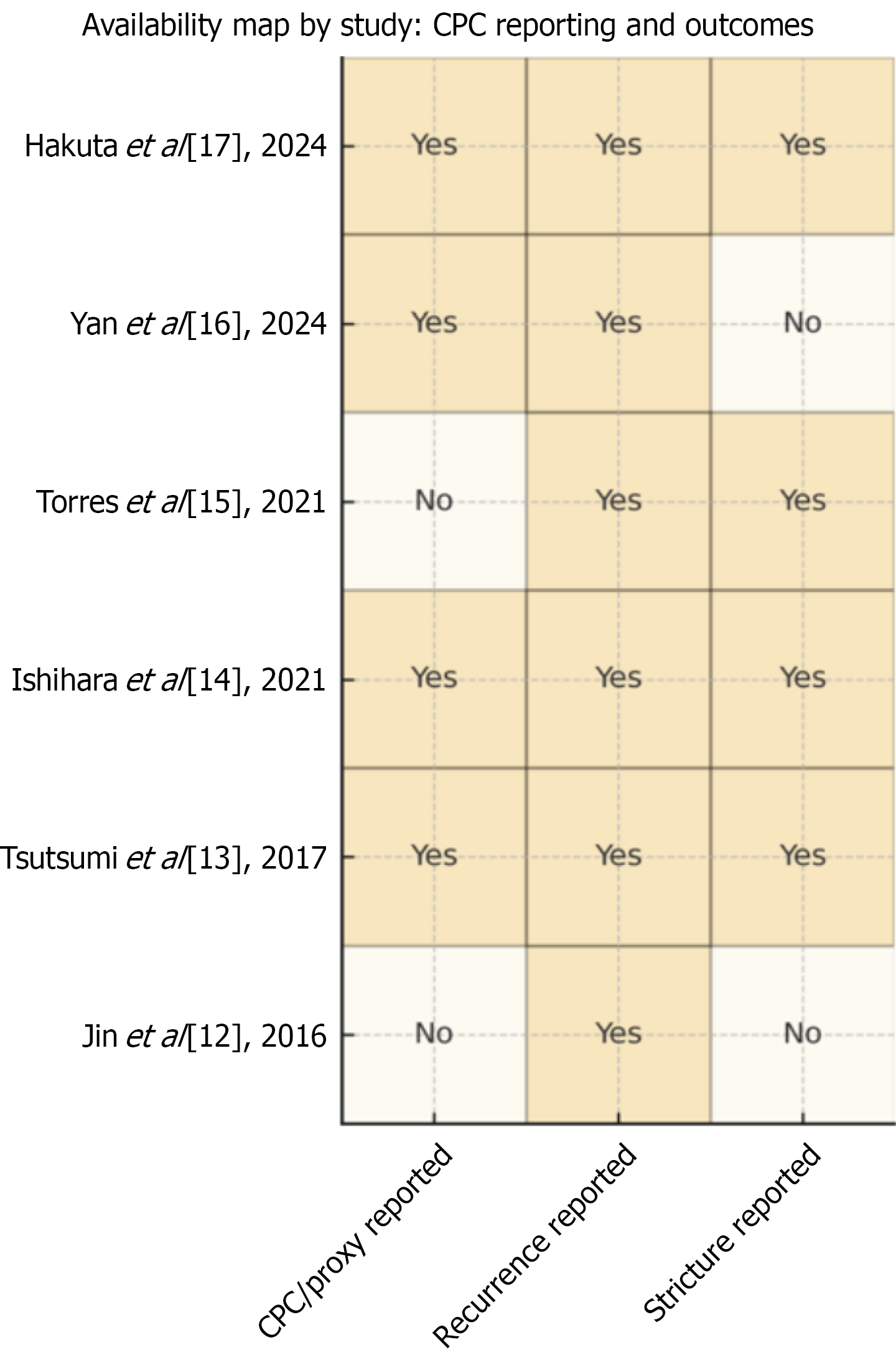 Figure 2 Availability map of chronic proliferative cholangitis reporting and related outcomes across included studies.