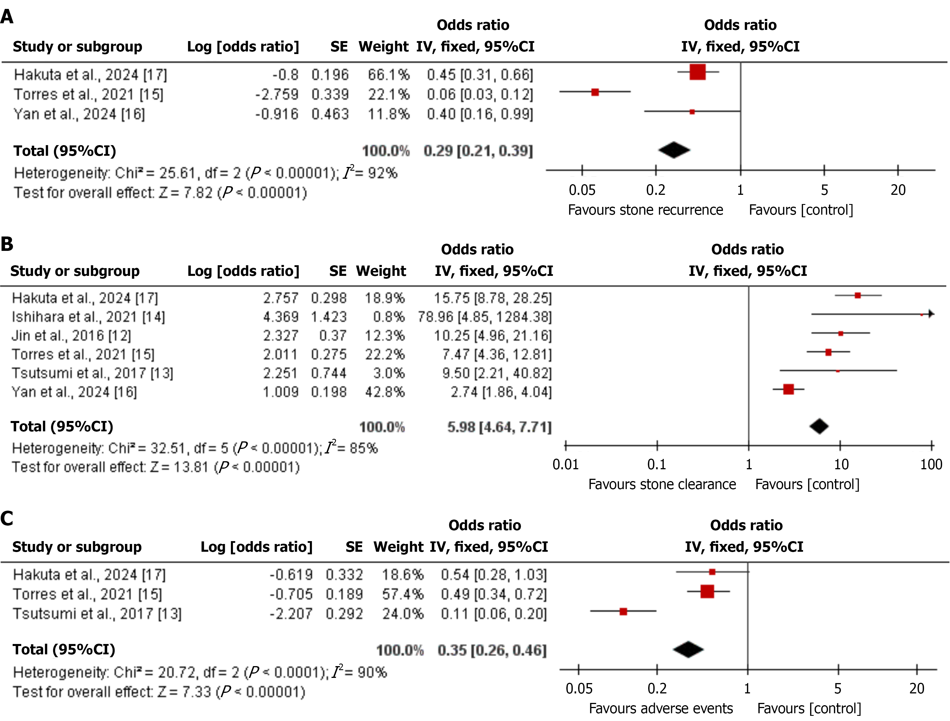 Each forest plot shows the study-specific event rate and the pooled estimate using a random-effects model. Study weights are indicated by square size, and horizontal lines show 95% confidence intervals; the diamond shows the pooled estimate and its 95% confidence interval. The X-axis represents the event rate (proportion). Because these are single-arm meta-analyses, there is no true control group. In these plots, the “control” column shown by Review Manager is not used and should be interpreted as a placeholder required by the software; only the treated study cohort contributes data. A: Stone recurrence: Events are patients with imaging-confirmed recurrent stones during follow-up; B: Stone clearance: Events are patients with complete stone clearance (stone-free status) after the index procedure; C: Adverse events: Events are patients with procedure-related complications as reported in each study. CI: Confidence interval.