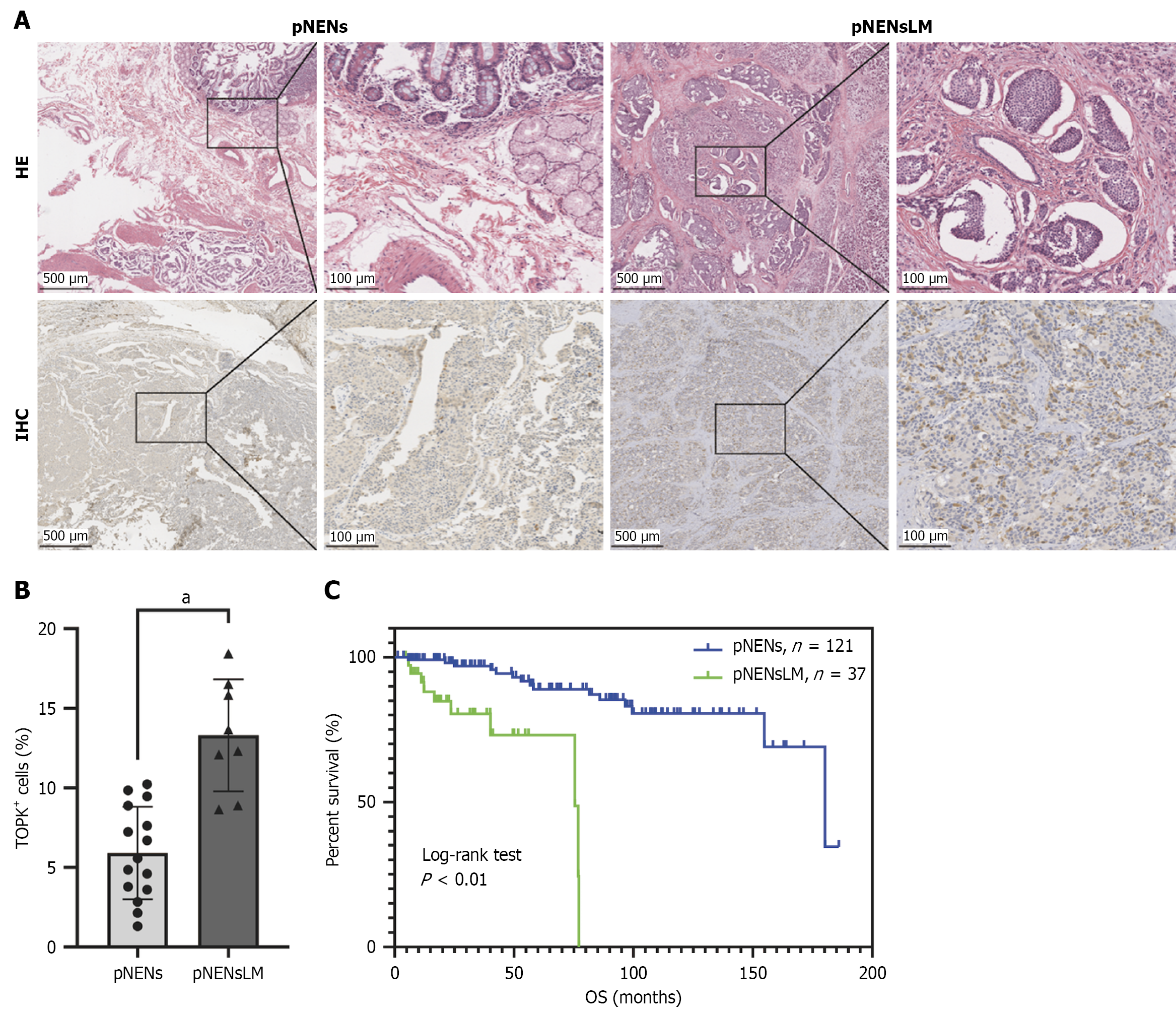 A: Representative immunohistochemical staining of T-LAK cell-originated protein kinase in pancreatic neuroendocrine neoplasm (pNEN) tissue samples with and without liver metastasis; B: Quantification of T-LAK cell-originated protein kinase-positive cells in pNENs with and without liver metastasis. The mean ± SD is used for data representation; C: Kaplan-Meier survival curves for patients with pNENs with and without liver metastasis, showing a significantly shorter overall survival for the liver metastasis group. aP < 0.0001. HE: Hematoxylin-eosin staining; IHC: Immunohistochemistry; TOPK: T-LAK cell-originated protein kinase; pNEN: Pancreatic neuroendocrine neoplasm; pNENsLM: Pancreatic neuroendocrine neoplasms in the live metastasis; OS: Overall survival.