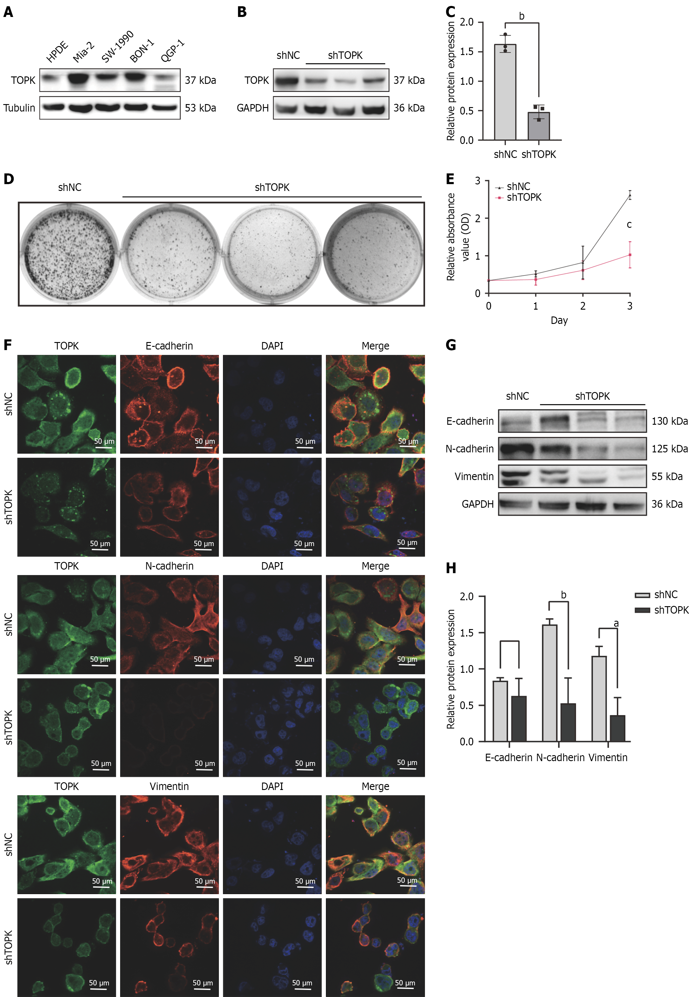 A: Western blotting of T-LAK cell-originated protein kinase (TOPK) expression in normal pancreatic duct epithelial cells (HPDE), pancreatic ductal adenocarcinoma cell lines (Mia-2, SW-1990), and pancreatic neuroendocrine tumor cell lines (BON-1, QGP-1); B and C: Western blot confirming TOPK knockdown in BON-1 cells transfected with short hairpin TOPK; D: Colony formation assay showing reduced colony formation in TOPK knockdown BON-1 cells compared to control; E: Cell counting kit-8 assay demonstrating decreased cell proliferation in TOPK knockdown BON-1 cells; F: Immunofluorescence staining showing reduced N-cadherin and vimentin expression in TOPK knockdown cells; G and H: Western blot analysis confirming the reduction of epithelial-mesenchymal transition-related proteins N-cadherin and vimentin in TOPK knockdown cells. The mean ± SD is used for data representation. aP < 0.01; bP < 0.001; cP < 0.0001. TOPK: T-LAK cell-originated protein kinase; GAPDH: Glyceraldehyde-3-phosphate dehydrogenase; shNC: Short hairpin negative control; shTOPK: Short hairpin T-LAK cell-originated protein kinase; DAPI: 4’,6-diamidino-2-phenylindole.