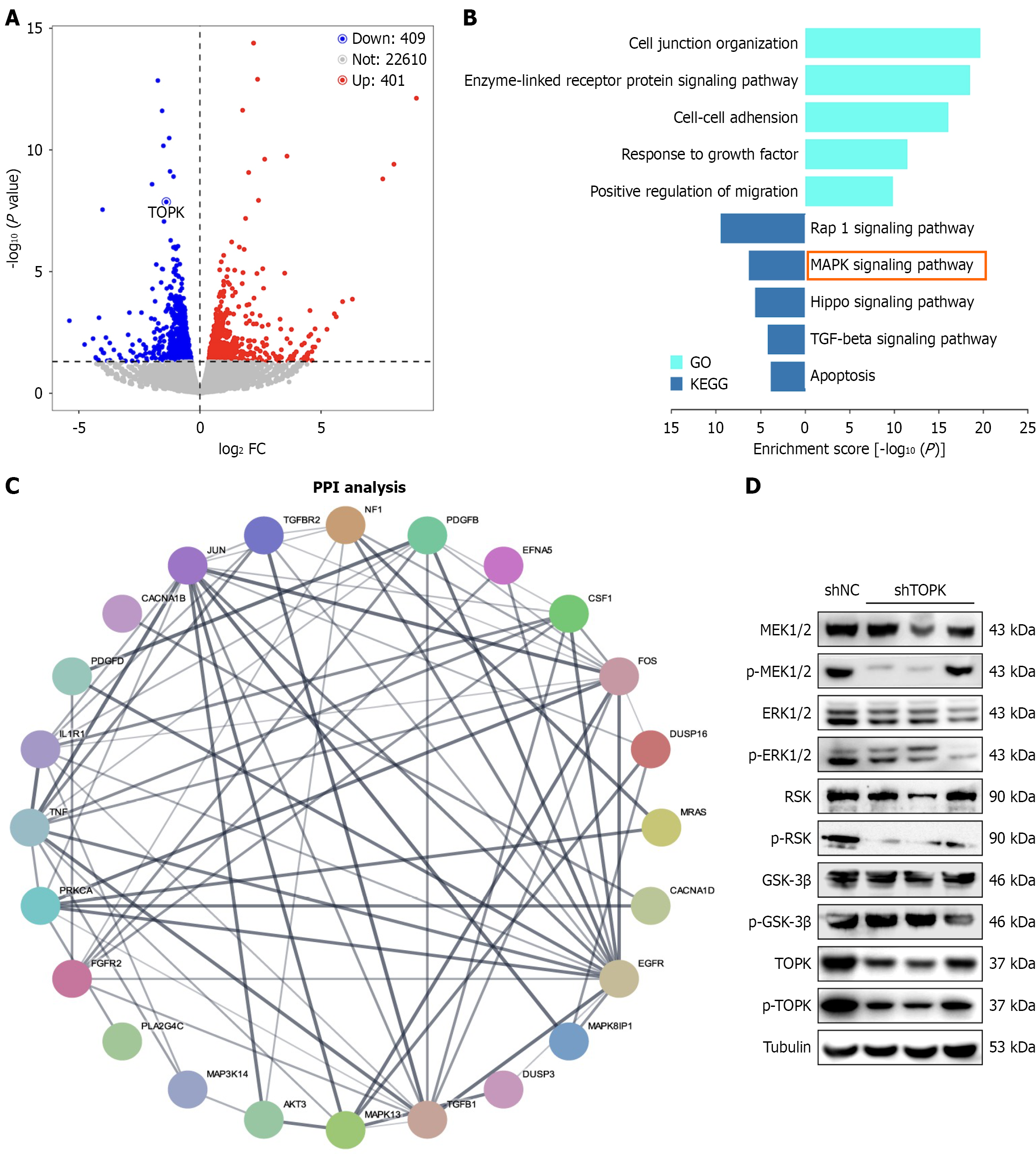A: Volcano plot of differentially expressed genes in short hairpin T-LAK cell-originated protein kinase (TOPK) and short hairpin negative control groups, highlighting significant gene expression changes. TOPK is specifically marked; B: Gene Ontology and Kyoto Encyclopedia of Genes and Genomes pathway enrichment analysis of downregulated genes in TOPK knockdown cells, showing significant involvement in the mitogen-activated protein kinase (MAPK) axis; C: Protein-protein interaction network analysis of downregulated genes involved in the MAPK signaling pathway; D: Western blot analysis showing reduced phosphorylation levels of MAPK kinase 1/2, extracellular signal-regulated kinase 1/2, and ribosomal S6 kinases in TOPK knockdown cells. TOPK: T-LAK cell-originated protein kinase; MAPK: Mitogen-activated protein kinase; TGF: Transforming growth factor; GO: Gene Ontology; KEGG: Kyoto Encyclopedia of Genes and Genomes; PPI: Protein-protein interaction; shNC: Short hairpin negative control; shTOPK: Short hairpin T-LAK cell-originated protein kinase; MEK: Mitogen-activated protein kinase kinase; ERK: Extracellular signal-regulated kinase; RSK: Ribosomal S6 kinase; GSK-3β: Glycogen synthase kinase-3 beta; p: Phosphorylated.