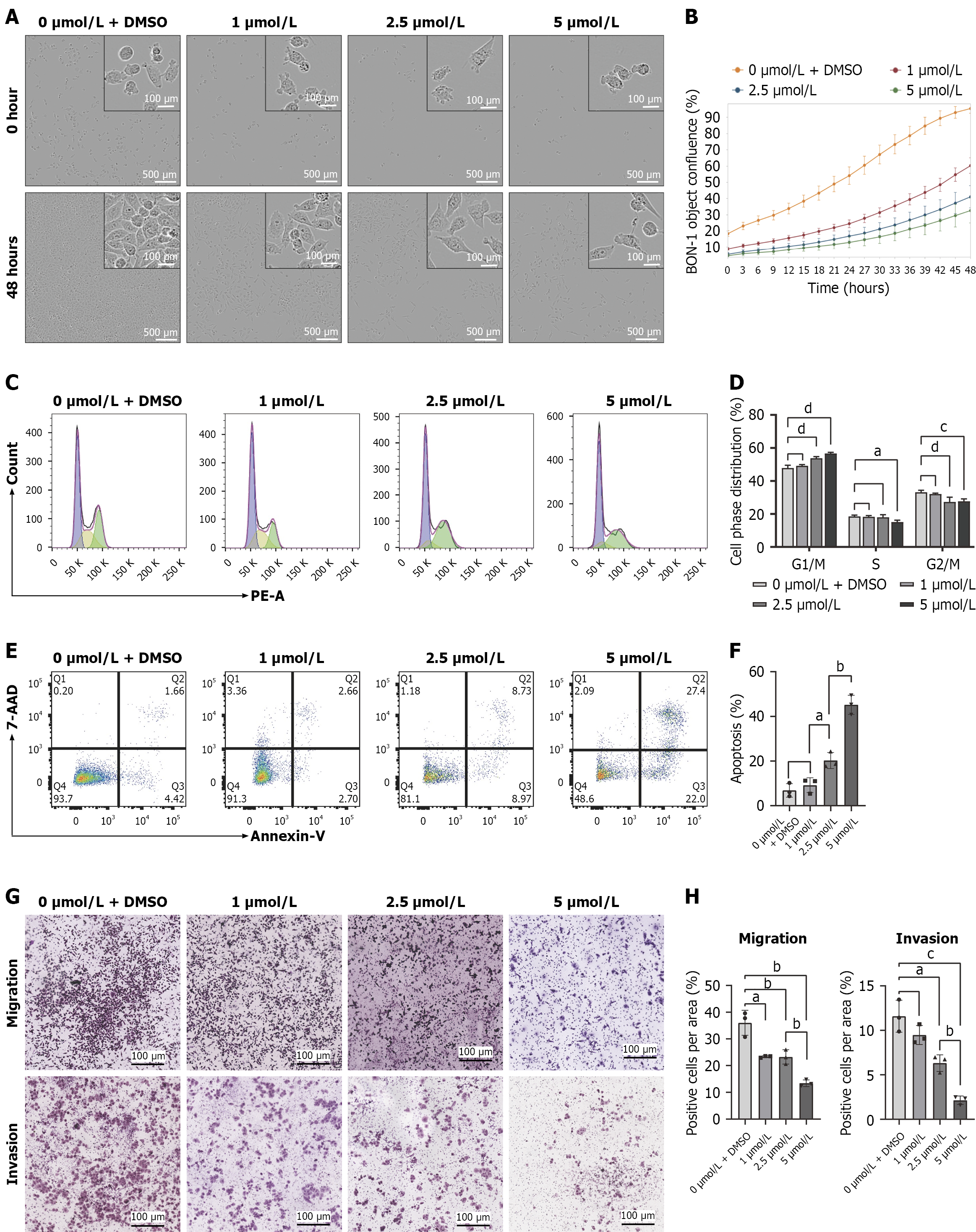 A: Dose-response curve of HI-TOPK-032 treatment on BON-1 cell viability; B: IncuCyte analysis showing significant inhibition of BON-1 cell growth after 48 hours of HI-TOPK-032 treatment; C and D: Flow cytometry analysis of cell cycle distribution in HI-TOPK-032-intervened BON-1, showing G1/M phase prolongation and G2/M phase shortening; E: Flow cytometry-based apoptosis analysis of HI-TOPK-032-intervened BON-1; F: Apoptotic cell quantification following HI-TOPK-032 treatment; G: Transwell assay showing reduced migration and invasion of HI-TOPK-032-treated BON-1; H: Transwell migration assay quantifying the migration of HI-TOPK-032-treated BON-1. Matrigel invasion assay quantifying the invasion of HI-TOPK-032-treated BON-1. The mean ± SD is used for data representation. aP < 0.05; bP < 0.01; cP < 0.001; dP < 0.0001. DMSO: Dimethyl sulfoxide.