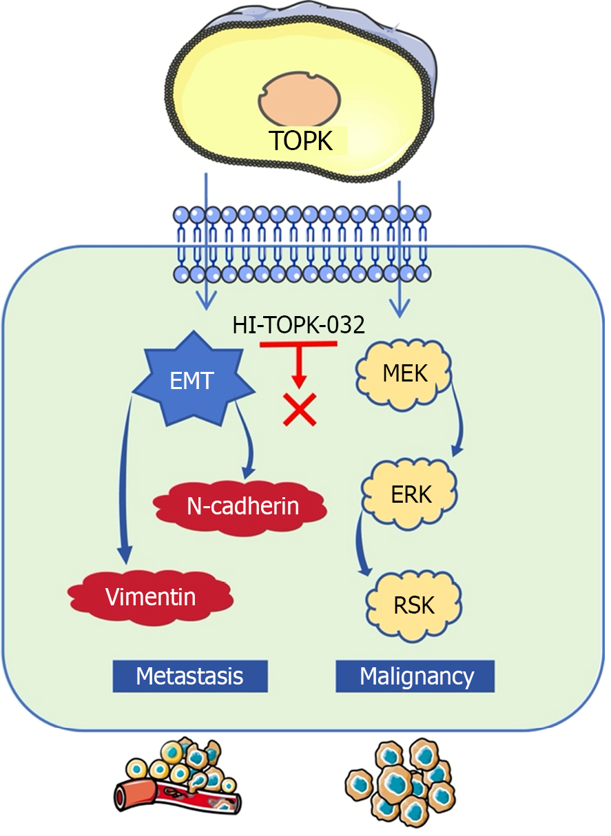 Schematic representation of T-LAK cell-originated protein kinase enhancing tumorigenesis and metastasis in pancreatic neuroendocrine neoplasms via mitogen-activated protein kinase and epithelial-mesenchymal transition signaling pathway activation. HI-TOPK-032 inhibits this pathway, reducing pancreatic neuroendocrine neoplasm cell proliferation, migration, and invasion. TOPK: T-LAK cell-originated protein kinase; MEK: Mitogen-activated protein kinase kinase; ERK: Extracellular signal-regulated kinase; RSK: Ribosomal S6 kinase; EMT: Epithelial-mesenchymal transition.