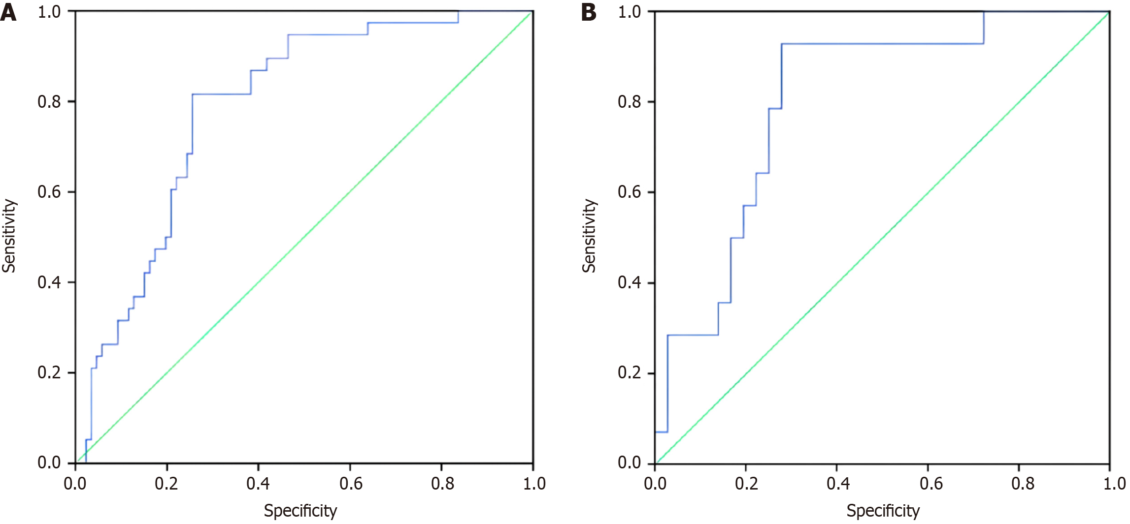 A: Receiver operating characteristic curve of the prediction model for pancreatic fistula after pancreaticoduodenectomy; B: Receiver operating characteristic curve of the prediction model for pancreatic fistula after pancreaticoduodenectomy in validation set.