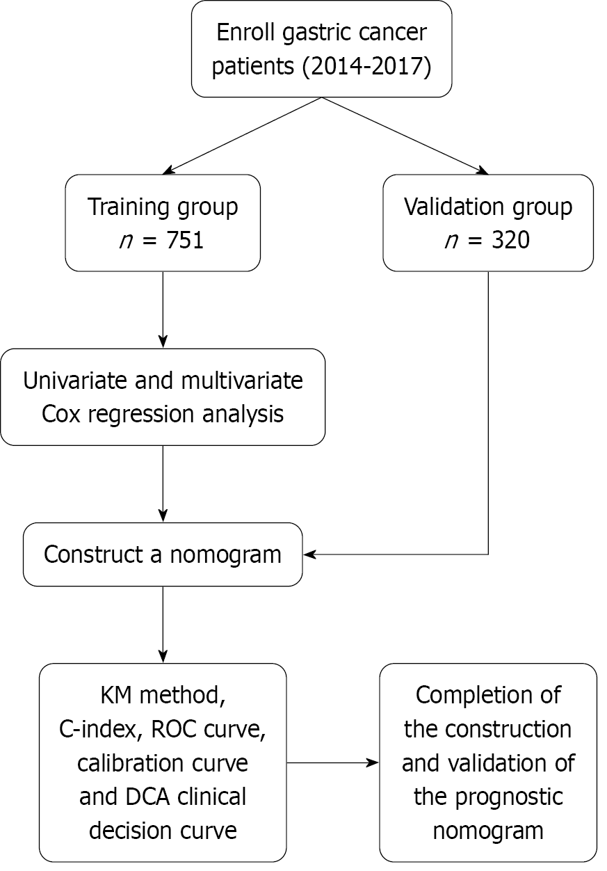 Our study was a retrospective clinical investigation, with medical history data primarily collected from The Medical Records Department of The First Affiliated Hospital of Anhui Medical University. Clinical data of patients with GC who underwent radical surgery at our hospital between 2014 and 2017 were collected for analysis. Figure 1 presents a general flowchart of the study. The Ethics Committee of The First Affiliated Hospital of Anhui Medical University approved this study.