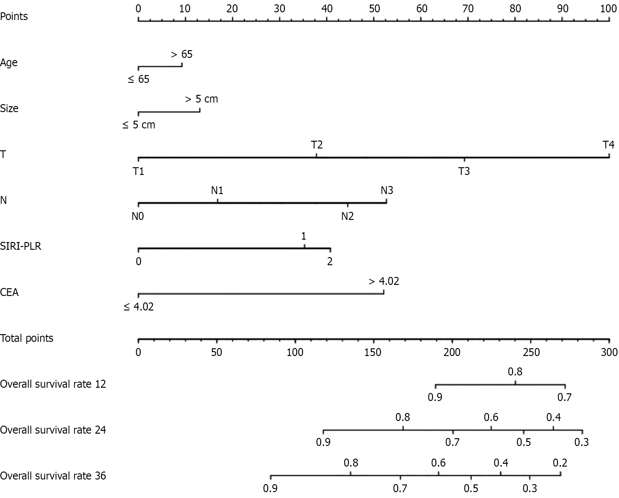 Core Tip: In this study, 1071 patients with stage I-III gastric cancer who underwent radical gastrectomy at The First Affiliated Hospital of Anhui Medical University were followed up, and relevant clinicopathological factors were collected. A new scoring system called systemic inflammation response index (SIRI)-platelet-to-lymphocyte ratio (PLR) was calculated. Through univariate and multivariate Cox regression analyses, six indicators significantly associated with survival were identified: Age, tumor size, T stage, N stage, SIRI-PLR, and carcinoembryonic antigen. A nomogram model was then constructed and validated.